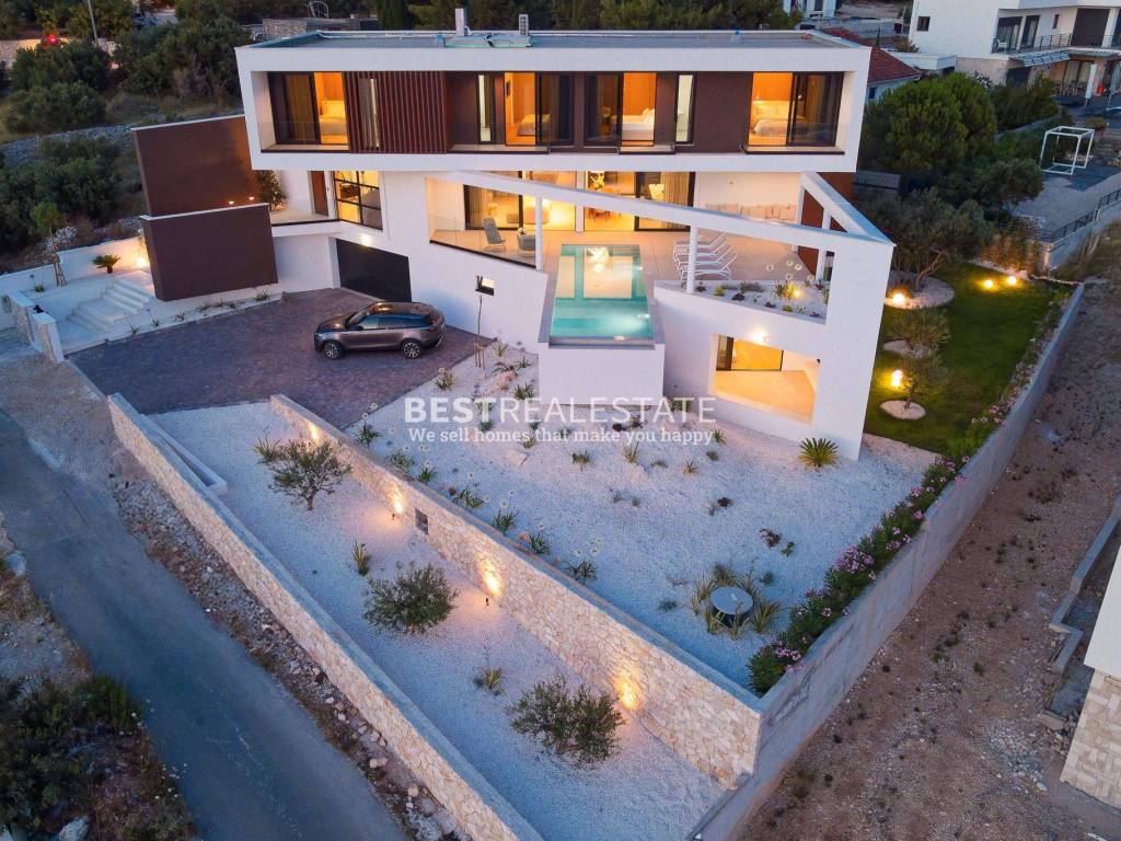 PRIZEMLJE Garaža za 2 automobila Vanjski parking za 3–4 vozila Igraonica Izdvojen apartman sa spavaćom sobom, mini kuhinjom i kupaonicom (ulaz skriven iza kuhinjskih vrata) PlayStation room za zabavu i opuštanje PRVI KAT Prostrana, potpuno opremljena kuhinja Dnevni boravak WC Velika istočna terasa s vanjskom kuhinjom Zapadna terasa s grijanim preljevnim bazenom Radna soba koja može služiti kao dodatna spavaća soba DRUGI KAT 4 luksuzne spavaće sobe, svaka s vlastitom kupaonicom i privatnim balkonom OPREMA I TEHNIČKE ZNAČAJKE Kompletno vodeno podno grijanje Samsung Wind-Free klima uređaji u svim sobama Hella električni brisoleji – najmoderniji sustav zaštite od sunca (kuhinja i dnevni boravak) Aluminijska stolarija visoke kvalitete Grijani preljevni bazen Integrirani high-end audio sustav (vanjska terasa + interijer) Dizajnerska talijanska rasvjeta (Luceplan, Deltalight…) Videonadzor Sustav navodnjavanja Vila se prodaje potpuno namještena, s pomno biranim dizajnerskim namještajem Ova jedinstvena vila predstavlja spoj modernog dizajna, vrhunske opreme i spektakularne lokacije – idealna za život, odmor ili investiciju.