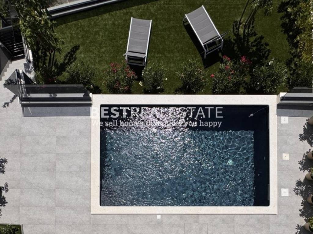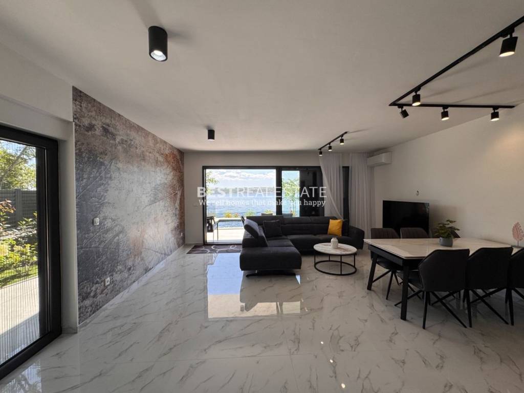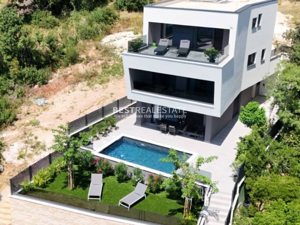 Ključne značajke Prvi red do mora s direktnim izlazom na plažu Potpuna privatnost i skriven prilaz Privatno parkiralište za više vozila Uređeni mediteranski vrt s oleandrima i ukrasnim stablima Vanjski dio nudi bazen 6×4 metra, sunčalište, lounge zonu i travnatu terasu s panoramskim pogledom