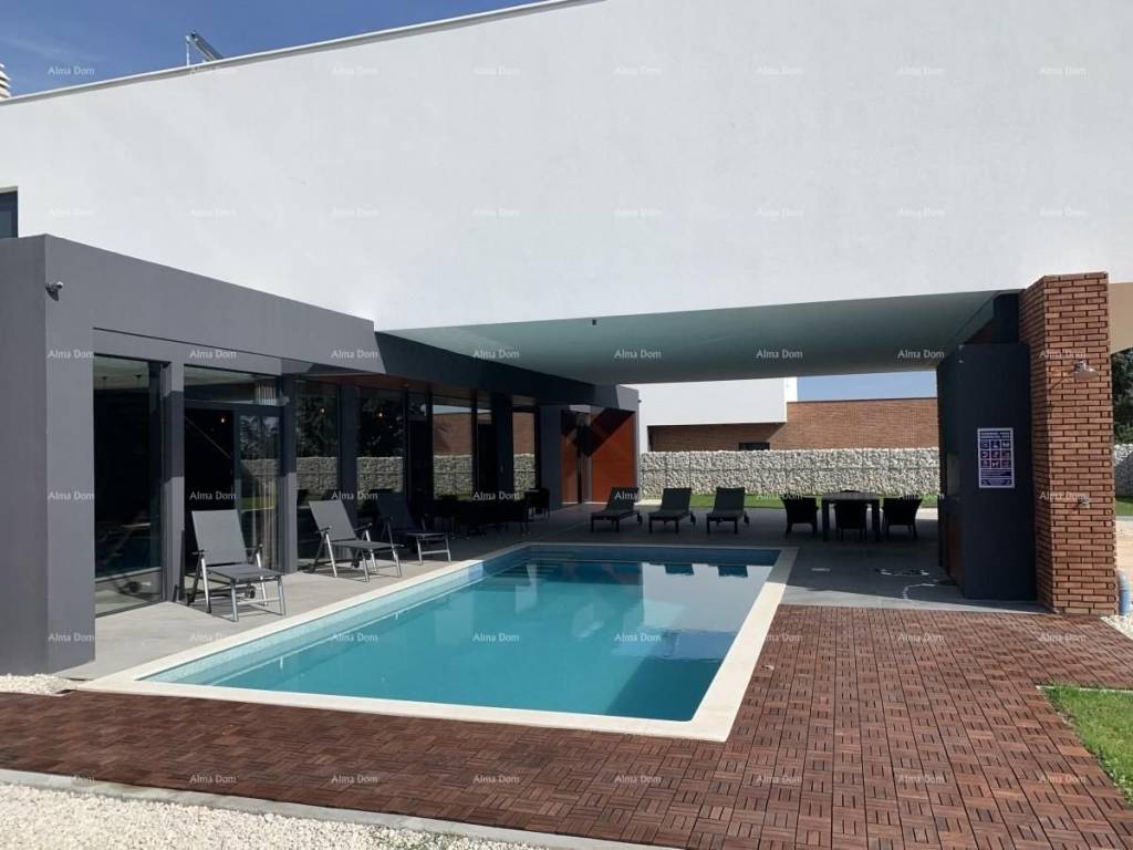 Beautiful modern detached house in Ližnjan. The house has a surface area of 328 m² and is situated on 770 m² of landscaped green space. The ground floor of the house is wheelchair accessible and has no stairs. It features one bedroom with its own bathroom, a living room, and a kitchen. There is direct access to the infinity pool, which measures 42 m² and is heated, extending the villa"s rental season. Upstairs, there are four bedrooms, each with its own bathroom. All rooms are equipped with underfloor heating. Solar panels are installed on the roof. A large terrace runs the entire length of the villa. The property includes six parking spaces, and the house is equipped with an automatic irrigation system. In the evenings, modern lighting casts a subtle glow over the entire villa and garden. Contact: Azra Valjevac Phone: +385 91611 5706 Email: azra@almadominvest.com