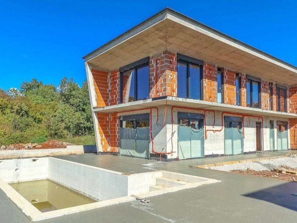 A detached house with a total area of 243 m² is for sale, consists of a living room, kitchen, dining room, terrace, work/technical room, guest toilet and a bedroom with a bathroom on the ground floor of the house, as well as a hallway, three bedrooms with bathrooms and a balcony on the first floor of the house. The house will have a 36 m² swimming pool, a 24 m² summer kitchen and a 5 m² pool storage area, underfloor heating, air conditioning in all bedrooms and in the living room, alarm, automatic garden irrigation, video surveillance and 3 parking spaces. The house is built on a plot of land of 1.080 m², it is located in a village approx. 12 km from the sea/beach and approx. 11 km from Poreč.