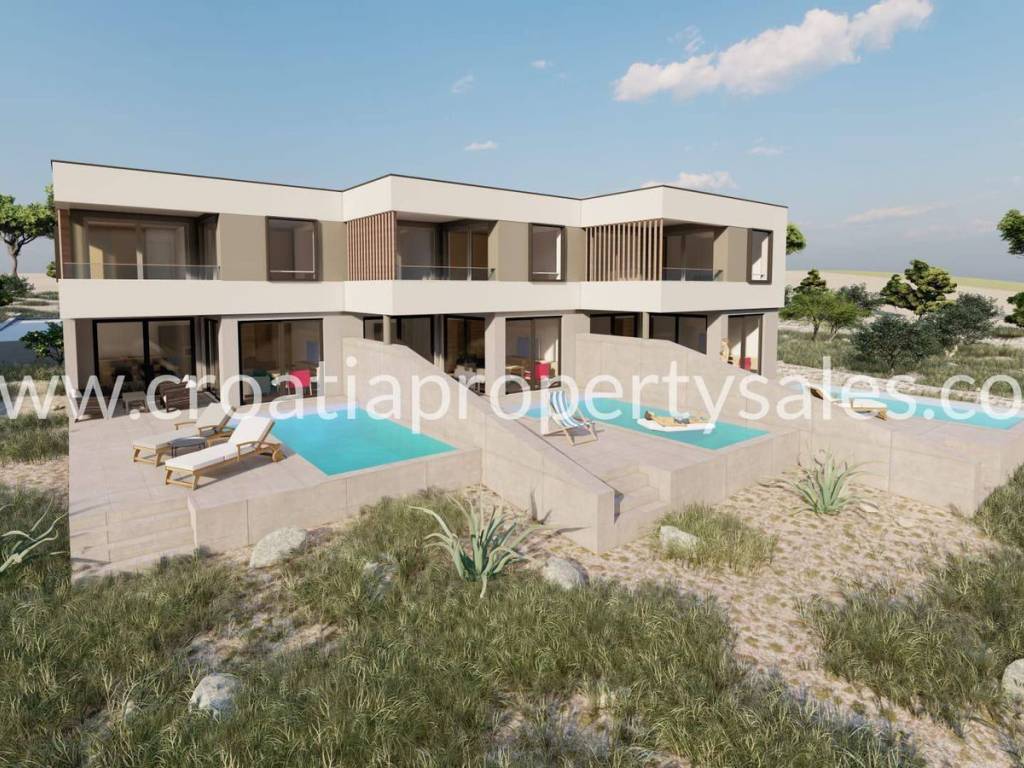 New project!Modern building on a plot of 913 m2. It consists of three residential units i.e. three duplex apartments.Each apartment consists of ground floor and first floor. The ground floor consists of a living room with kitchen, bathroom and study/bedroom and terrace.The upper floor is of two bedrooms and two bathrooms. Each apartment has a swimming pool.The price of the middle apartment is 620,000 euros, while the others are 640,000 euros.