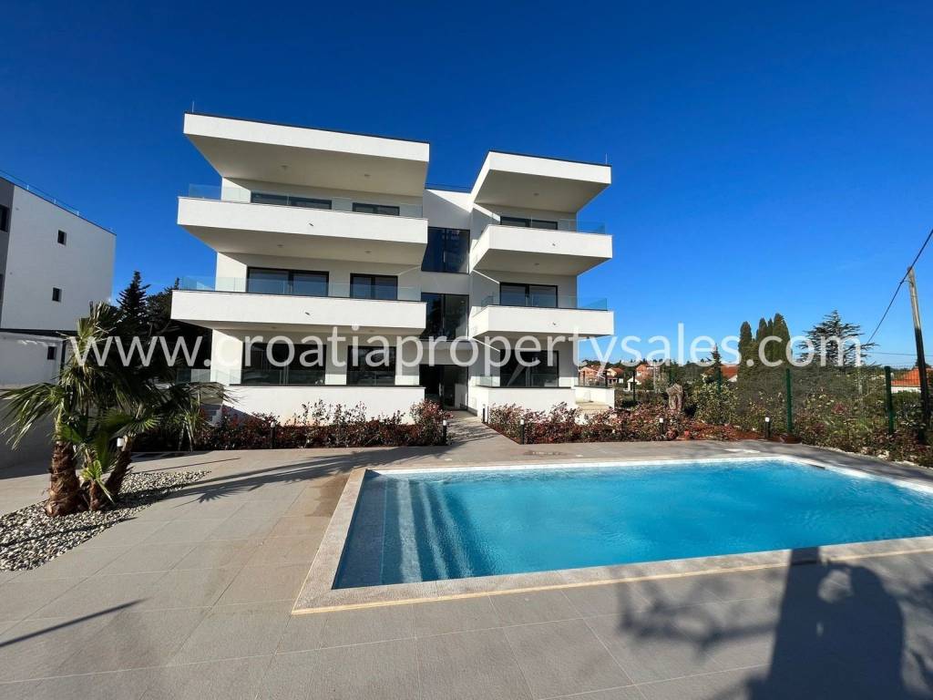 Apartment buildings located in the Zadar Archipelago.Two detached houses located on a total land area of 1422 m2.There are two apartments on each floor - a three-bedroom and a four-bedroom. There are a total of 12 apartments, ranging in size from 82.9 m2 to 113.78 m2.Three-room apartments have a total area of 82.9 m2, of which the internal area is 67.45 m2, and the terrace is 15.45 m2. The apartments are divided into two parts (day and night part), in the night part there are two bedrooms with a bathroom and two toilets, and in the day part there is a kitchen with a dining room and a living room with an exit to the terrace.Four-room apartments have a total area of 113.78 m2, of which the internal area is 89.18 m2, and the terrace is 24.6 m2. The apartment is divided into a day and two night parts.The master bedroom consists of two separate bedrooms and two smaller bathrooms. The residential part consists of a kitchen with a dining room and a living room with access to the terrace. The third bedroom is accessible from the living room, also has access to the terrace and has a separate bathroom with a bathtub, toilet and sink.In the basement of the property there are parking spaces and an elevator.On the complex itself, in front of the buildings, there is a shared pool and garden, and a roof terrace that offers a wonderful panoramic view of the entire coast. All of the above is for shared use.The distance from the sea is 150 m, and from the town center 450 m.The nearest airport is only 32 km away.A1 - 113.78 m2 with parking space and basement - EUR 509,143A2 - 82.9 m2 with parking space and basement - EUR 389,776A3 - 113.78 m2 with parking space and basement - EUR 524,090B1 - 113.78 m2 with parking space and basement - EUR 509,143B2 - 82.9 m2 with parking space and basement - EUR 389,776