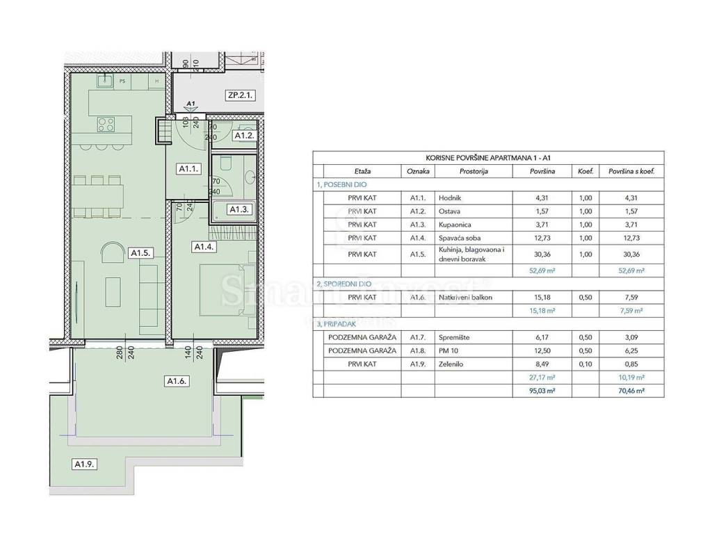total area of the apartment with secondary parts: 95.03 m2