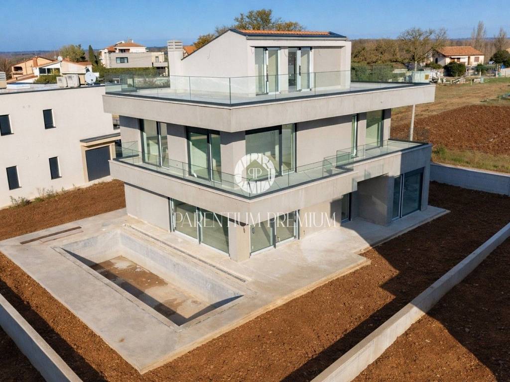 Istria, PorečFor sale is a modern villa located in a quiet area, just 3 km from the center of Poreč, with a total gross area of 325 m² and net living space of 220 m², situated on a 501 m² plot.The ground floor consists of an entrance hall, technical room, storage room, one bedroom, a bathroom, and a spacious open-plan living area with kitchen and dining room. The living area opens onto a covered terrace, sun deck, and swimming pool, creating an ideal space for outdoor living and relaxation.On the first floor, there are three bedrooms, each with its own bathroom, as well as a shared covered terrace.The second floor features an additional bathroom and a multifunctional room that can be used as a kitchen, wellness area, or sauna, along with a large uncovered terrace of 78 m² offering a sea view.The villa will be equipped with underfloor heating and air conditioning throughout, powered either by a heat pump or electric system, according to agreement with the buyer. The property includes 10 cm thermal insulation (EPS), aluminum and PVC joinery with shutters, heated towel rails in the bathrooms, and pre-installed first-phase wiring for a sauna.This property represents an excellent opportunity to purchase a luxury family home or a highly attractive investment for tourist rental.