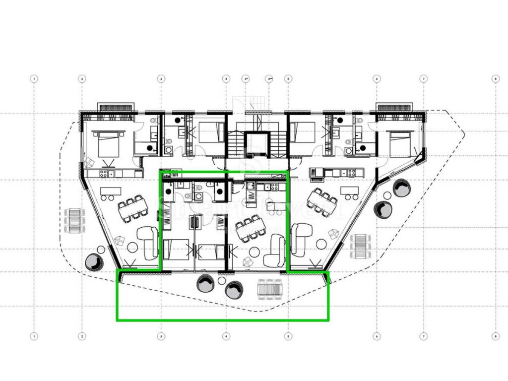The apartment of 94 m is located on the ground floor and impresses with its layout: a master bedroom with en-suite bathroom, an additional bedroom, an elegant bathroom and an open-space living room with kitchen and dining area. The living room and bedrooms open onto a large terrace - an ideal place to enjoy coffee with a sea view or dinner with a sunset.