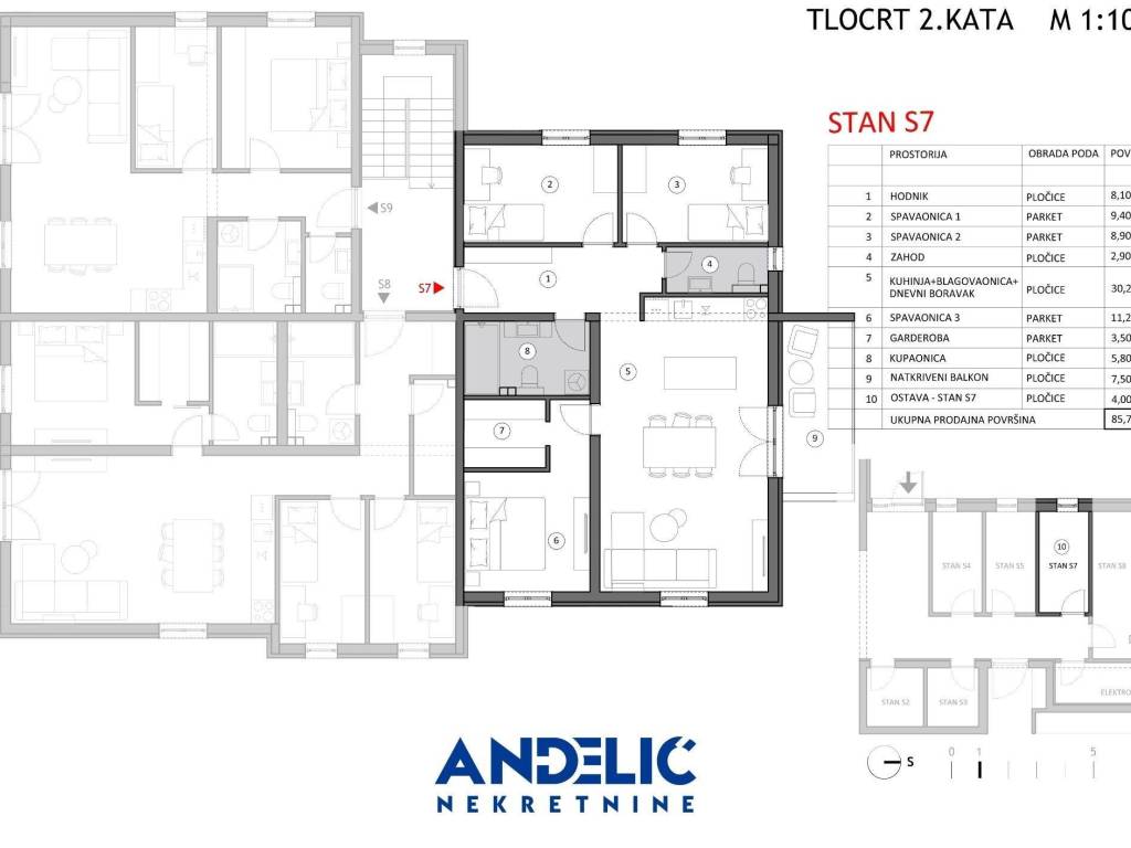Apartment S7 is a three-bedroom apartment, located on the second floor of the building. It consists of a kitchen and dining room with a living room, hallway, bathroom, toilet, storage room and three bedrooms. The apartment has a covered balcony of 7.50 m2.