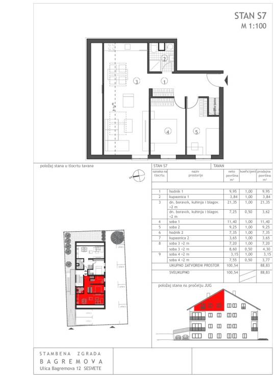 La surface habitable totale de 88,83 m² est répartie sur deux niveaux.