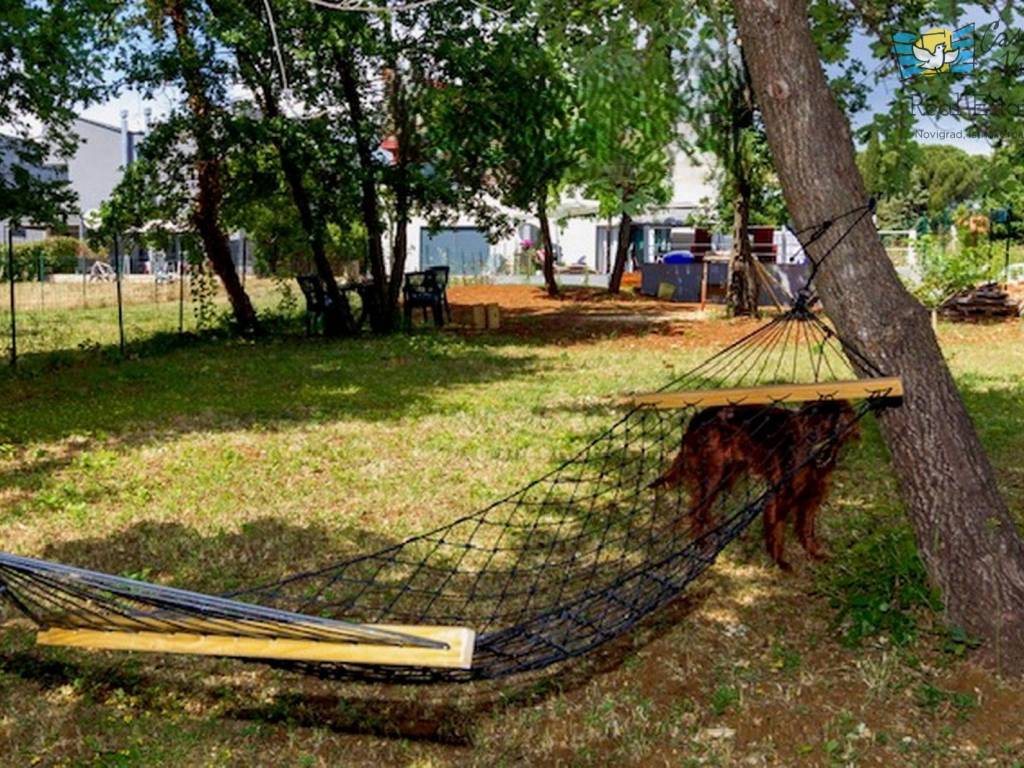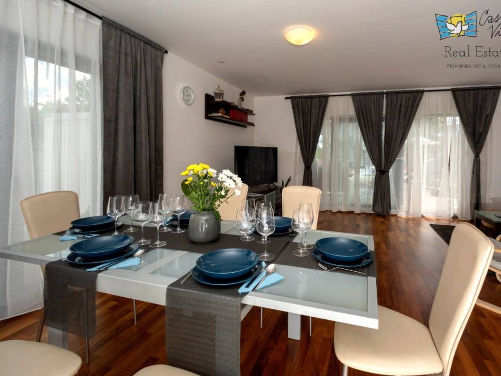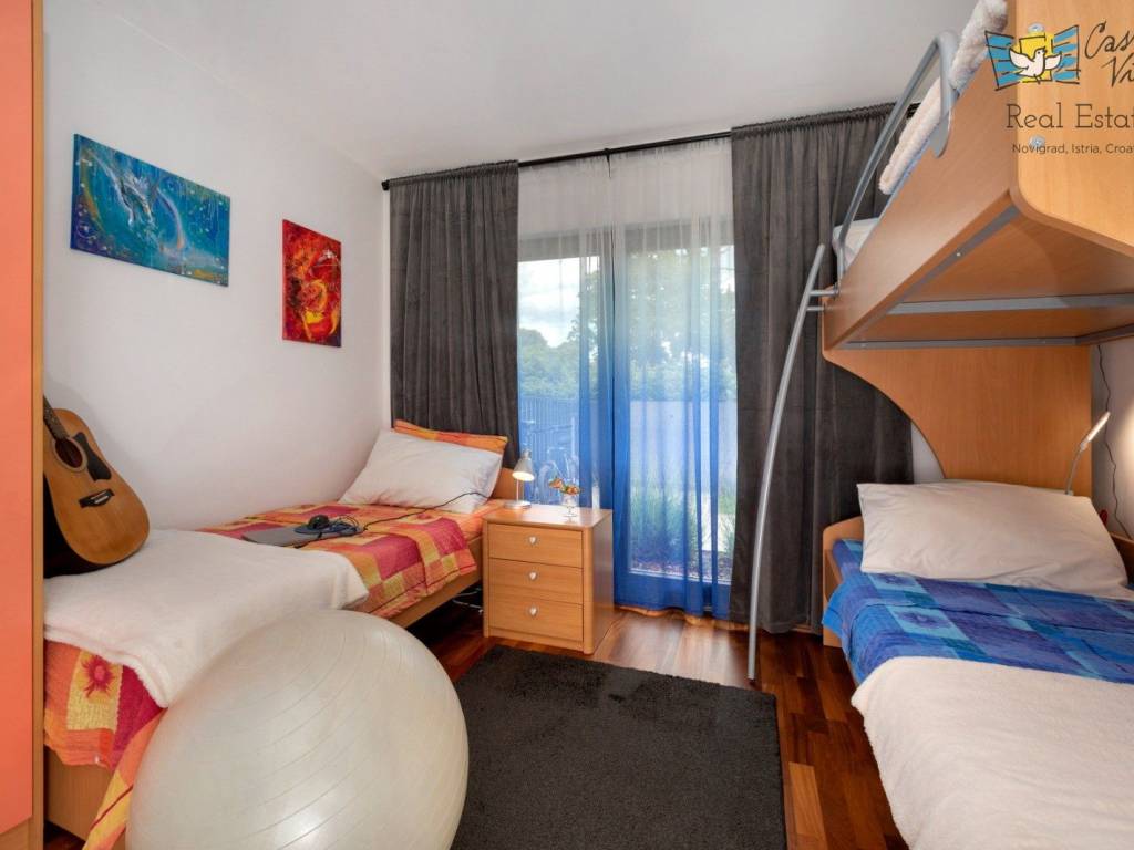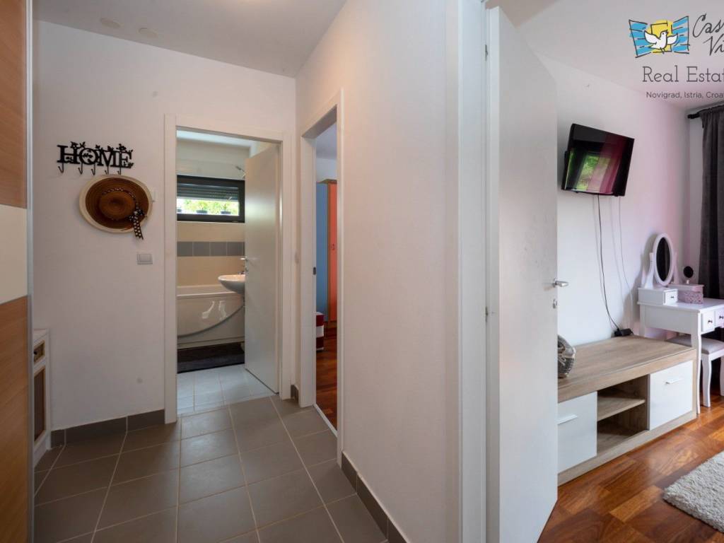 Prostran stan u Poreču od 98,45 m2 nalazi se u prizemlju zgrade, sa okućnicom od 919 m2. Zgrada je izgrađena 2012. godine. Udaljen je od mora cca 1300 m. Stan ima zaseban ulaz u odnosu na druge stanare. Sastoji se od ulaznog hodnika, dvije spavaće sobe, kupaone, toaleta/proaone, te velikog dnevnog prostora (dnevnog boravka sa kaminom, blagovaone i kuhinje). Iz dnevnog prostora se izlazi na terasu, vrt i bazen. U vrtu se osim terase nalazi bazen od 40 m2, vrtna kućica i zelena površina. Osjećaj je kao da se u vlastitoj kući. Grijanje/hlađenje je regulirano putem klime, dok u dnevnom boravku ima i kamin. Predstavlja odlični potencijal za turistički najam ili za cijelogodišnje življenje. Stanu pripadaju i dva parkirna mjesta.