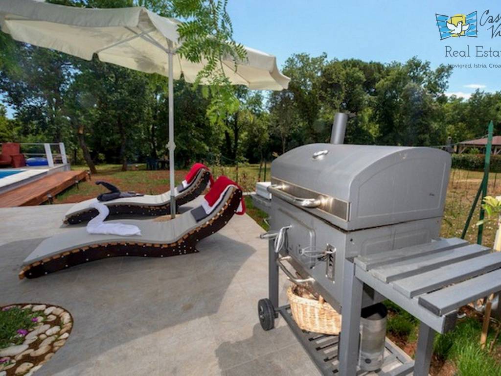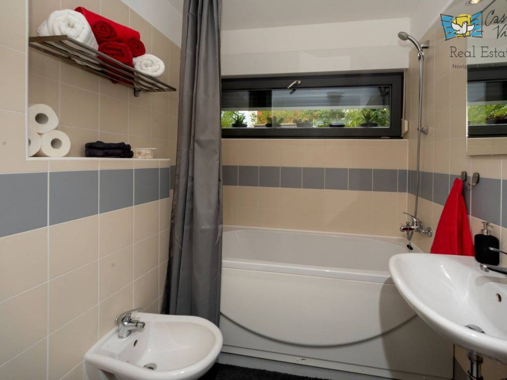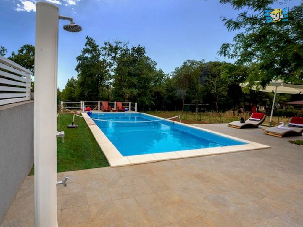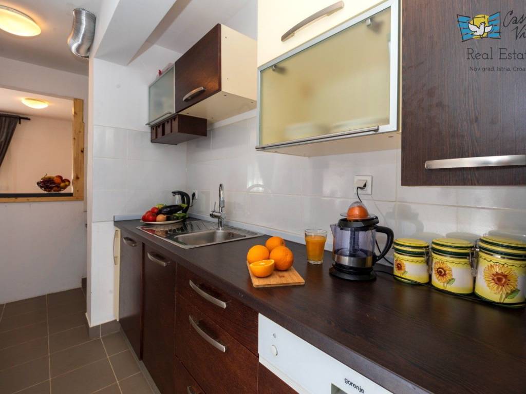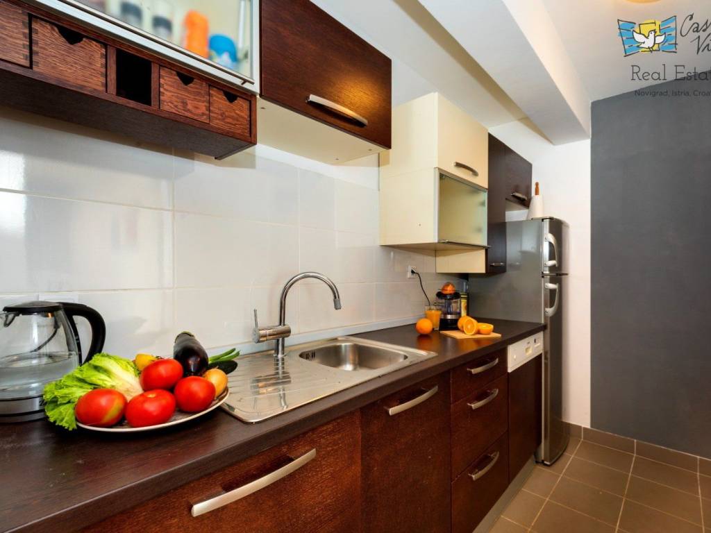 Prostran stan u Poreču od 98,45 m2 nalazi se u prizemlju zgrade, sa okućnicom od 919 m2. Zgrada je izgrađena 2012. godine. Udaljen je od mora cca 1300 m. Stan ima zaseban ulaz u odnosu na druge stanare. Sastoji se od ulaznog hodnika, dvije spavaće sobe, kupaone, toaleta/proaone, te velikog dnevnog prostora (dnevnog boravka sa kaminom, blagovaone i kuhinje). Iz dnevnog prostora se izlazi na terasu, vrt i bazen. U vrtu se osim terase nalazi bazen od 40 m2, vrtna kućica i zelena površina. Osjećaj je kao da se u vlastitoj kući. Grijanje/hlađenje je regulirano putem klime, dok u dnevnom boravku ima i kamin. Predstavlja odlični potencijal za turistički najam ili za cijelogodišnje življenje. Stanu pripadaju i dva parkirna mjesta.