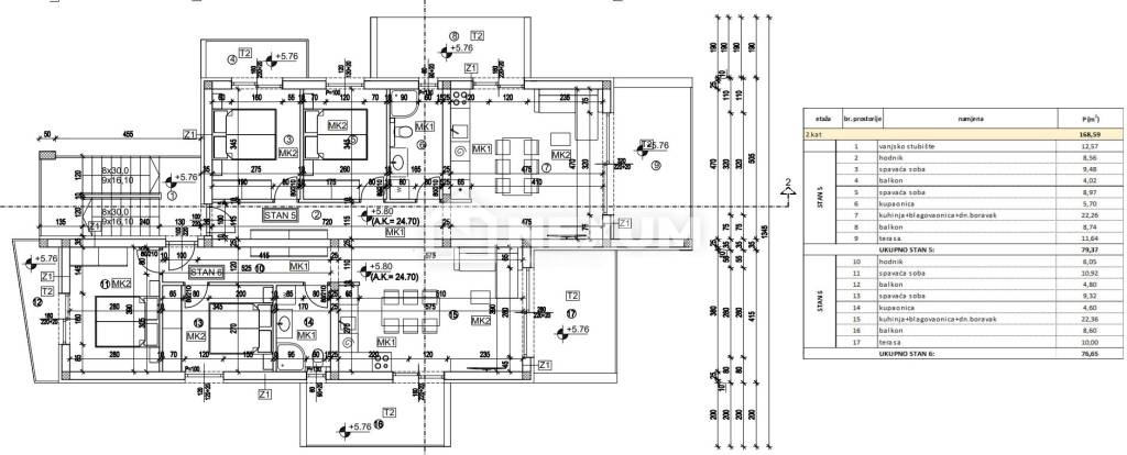 For sale is a two-bedroom penthouse (S6) on the second floor of the building with a total usable area of 94.25 m², of which the interior space is 53.25 m², the terrace is 10 m², and the balcony is 13.40 m².