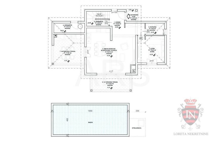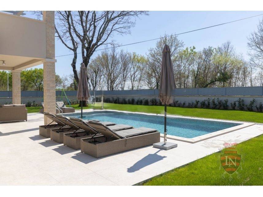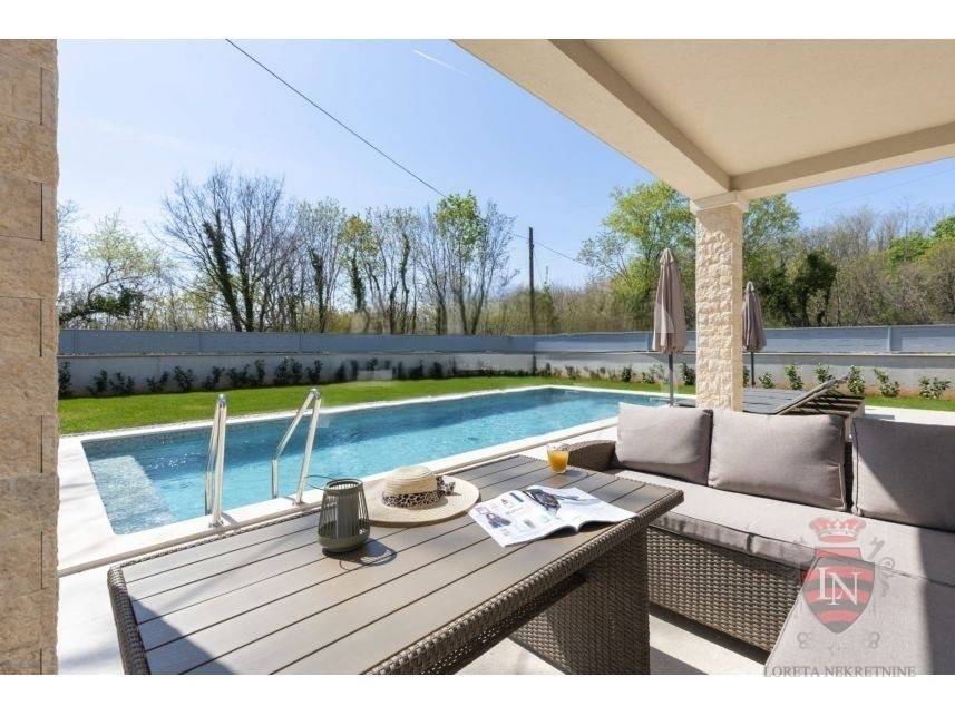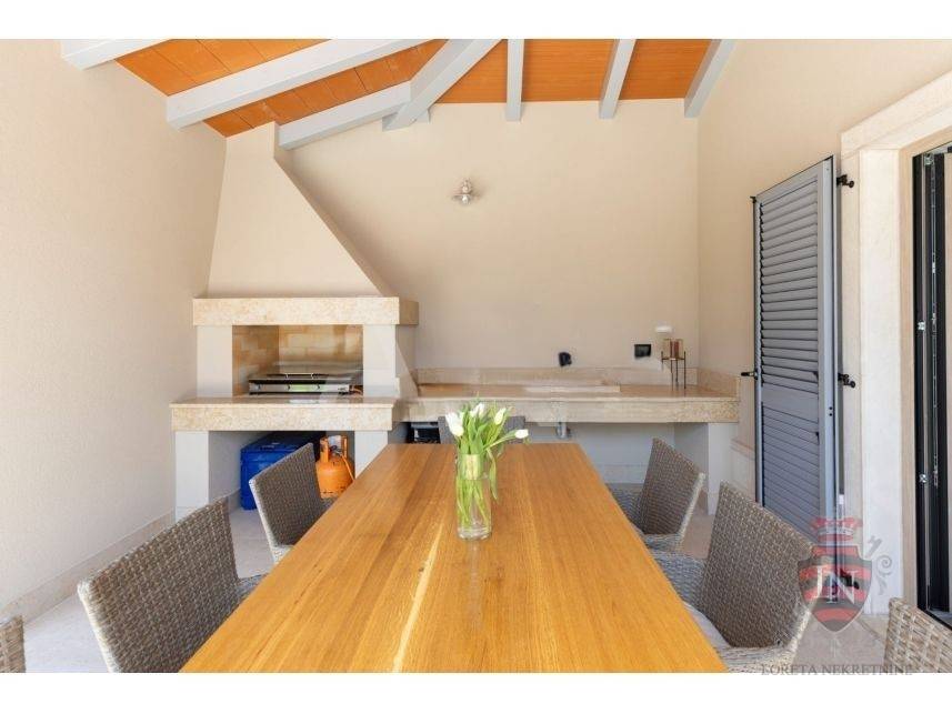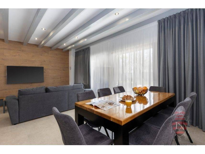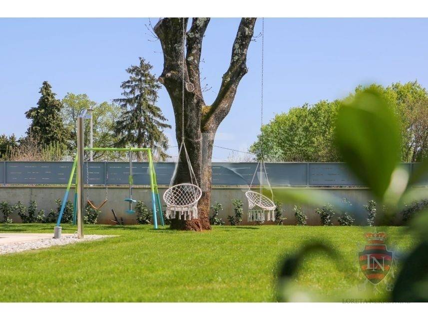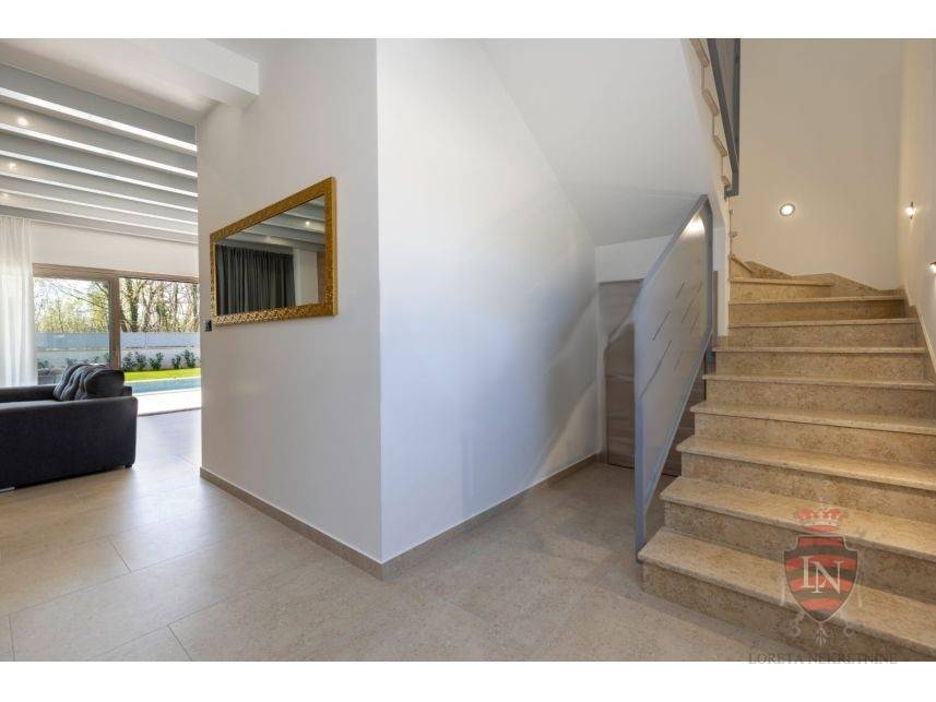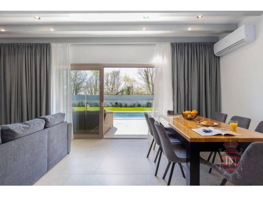The living room offers a beautiful view of the large swimming pool measuring 4 x 10 m, surrounded by a sunbathing area and a carefully landscaped garden, creating an ideal space for refreshment and enjoyment during the summer months.