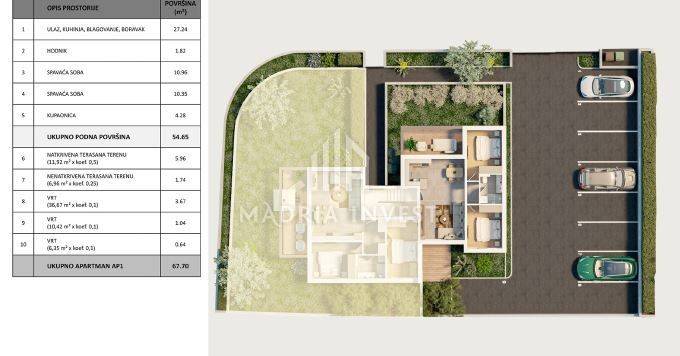 **For sale: Modern apartments in luxury villas with panoramic views of Novalja and the archipelago** The offer includes attractive apartments located in five contemporary villas built on a gentle slope, from which there is a spectacular view of the town of Novalja and the surrounding islands. Each apartment has one to two parking spaces, connected to the villas by pedestrian paths. The apartments are characterized by large glass surfaces that provide an unobstructed view of the sea, while the latest generation of modern PVC joinery ensures superior insulation. Spacious terraces with glass railings further emphasize the impression of luxury. Windows and sliding walls are equipped with electric shutters and mosquito nets for maximum comfort. The facades are made in a highly energy-efficient ETICS system. Air conditioning is provided via a "multi split" heating and cooling system, and the outdoor units are discreetly hidden behind decorative mesh structures that blend perfectly with the architecture of the building. The interior spaces are equipped with top-quality, first-class Italian ceramics, large format and straight cut. The bathrooms feature modern walk-in showers with glass partitions and quality sanitary equipment with built-in cisterns and elegant fittings. The staircases are covered with light quartz, in harmony with the colors characteristic of the stone of the island of Pag, and are equipped with modern railings. All entrance doors are high-quality, anti-burglary, with a multiple locking system. The courtyards are decorated with indigenous plants and landscaped according to top horticultural standards, with an implemented automatic irrigation system. The enclosing walls are made in the traditional drywall style of authentic Pag stone. The apartments also have a storage room in the basement of the building. All apartments are two-bedroom, with an area between 55 and 83 m², and have spacious terraces of 10 to 15 m². The ground floor apartments also have private gardens. **Planned move-in: Spring 2026**