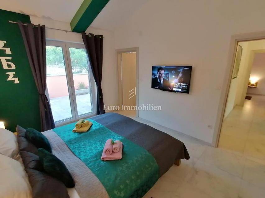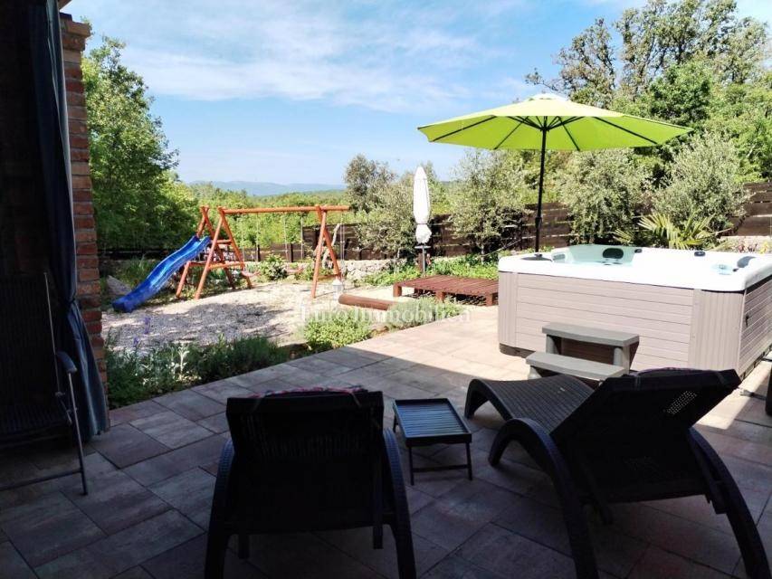 The island of Krk, a house in a quiet location of 120 m2 on a plot of 1686 m2. The house is a detached one-story house and consists of a spacious living room with a kitchen and dining room, two bedrooms (one has an extra bed on the higher level), two bathrooms, a toilet, a utility room, an anteroom and a terrace with a hot tub and barbecue. There is another terrace behind the house.