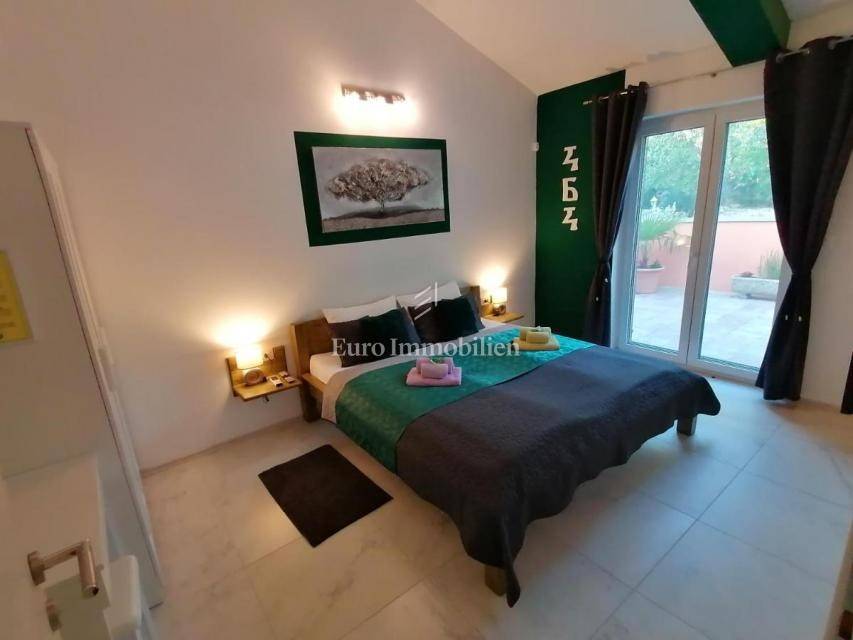 The spacious yard is decorated with carefully selected autochthonous Mediterranean herbs of this bench for relaxing in a forest atmosphere. The house is in a good location in the heart of the island of Krk, only 10-15 minutes by car from the larger settlements.