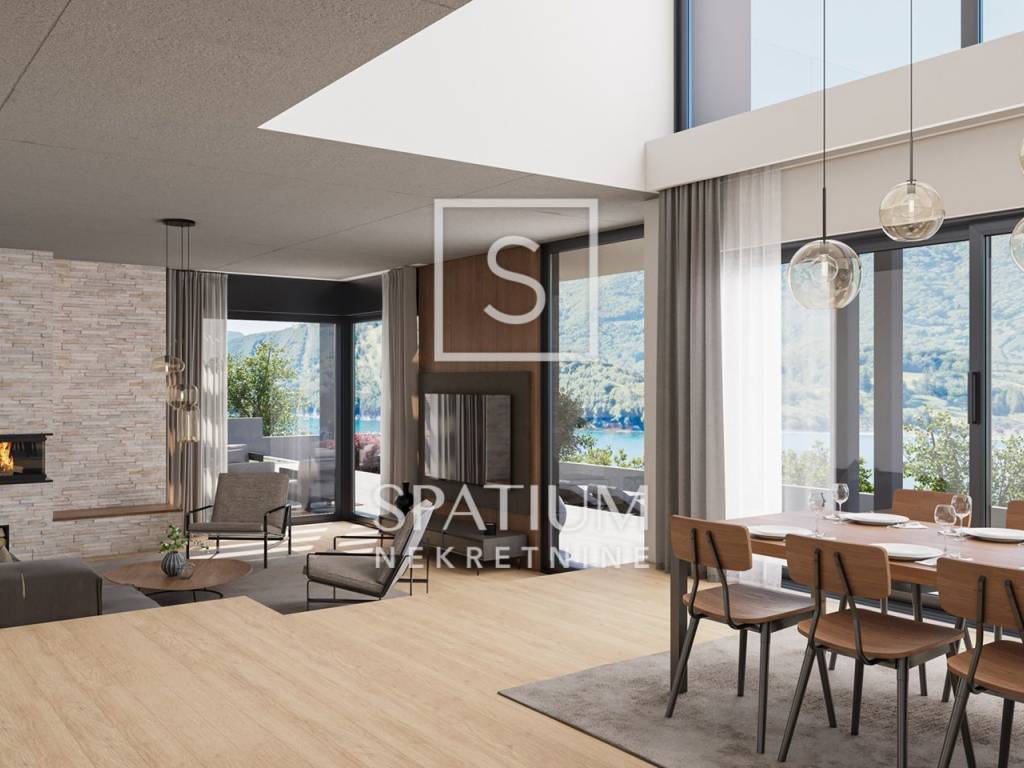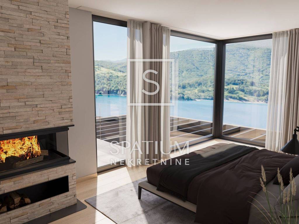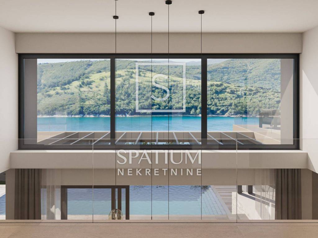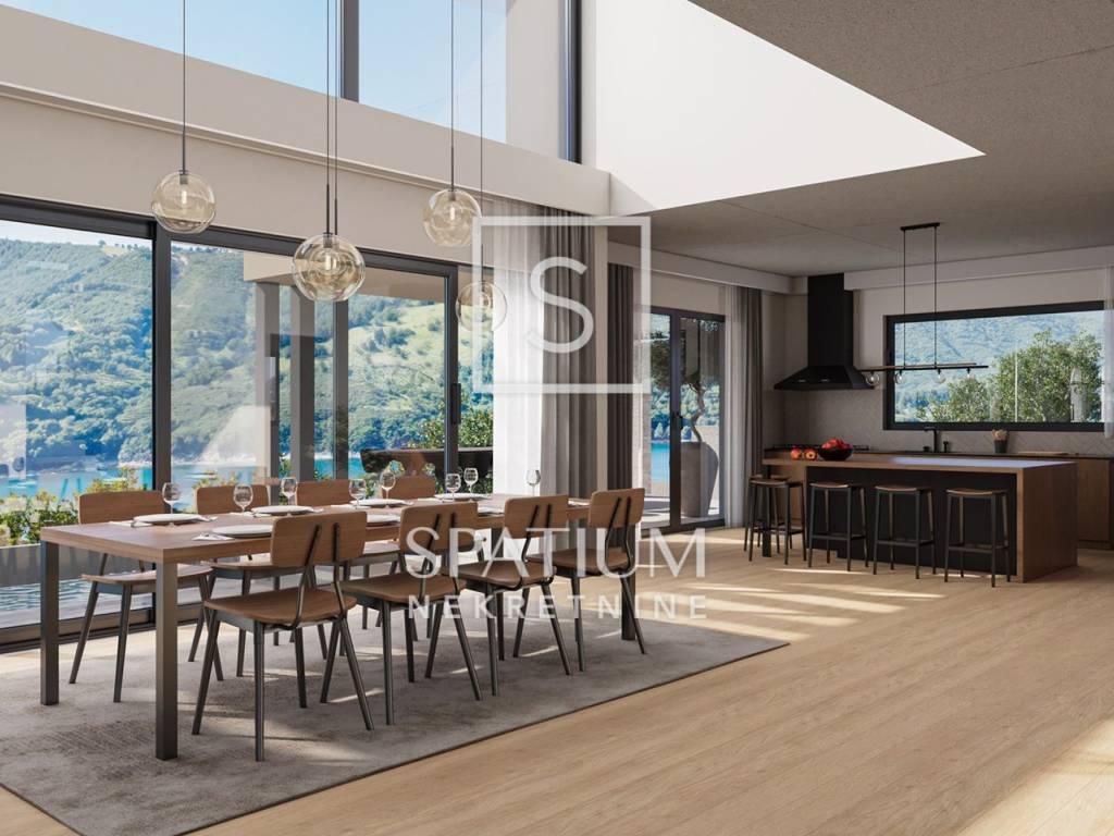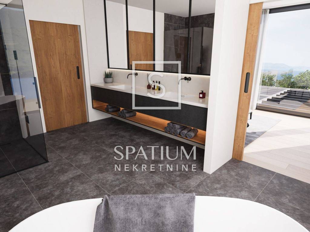 The villa extends over three levels – basement, ground floor and first floor – with a total net surface of 465 m² and is situated on a plot of 807 m² with direct access from an asphalt road. The basement is designed to include a gym, storage room and technical room. The ground floor consists of a garage, one bedroom, bathroom, storage space and a spacious open-plan living area with a kitchen and dining room. Large glass walls open the living space towards the covered terrace and the pool with sun deck, offering a panoramic sea view. On the upper floor, there are three bedrooms, each with a private bathroom, wardrobe, and access to uncovered terraces. Windows and doors have been installed, and part of the installations completed, allowing the future owner to finish the interior to their own preferences.