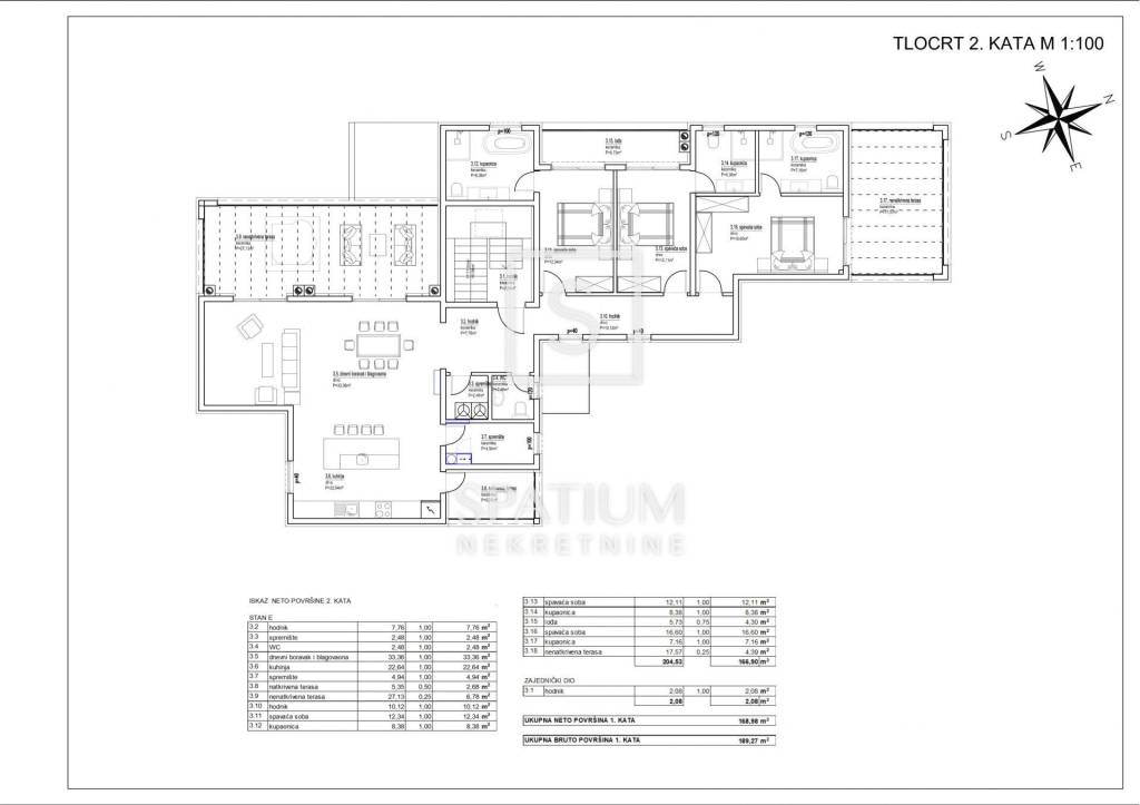 This stunning penthouse is located on the second floor of a residential building with only five units, offering a total living area of 167 m². It features an entrance hall, guest toilet, laundry room, a kitchen with access to a covered terrace, a dining area and a spacious living room opening onto an uncovered terrace. The property offers three en-suite bedrooms, two of which share a 6 m² loggia, while the master bedroom boasts its own private uncovered terrace. The penthouse enjoys breathtaking panoramic sea views, making it the perfect home for those seeking luxury, comfort and an exceptional location.