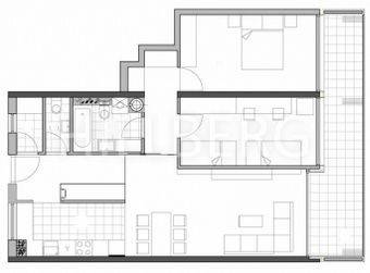 It consists of a living room with kitchen and dining room, 2 bedrooms, loggia, bathroom with bathtub, toilet and storage room.
