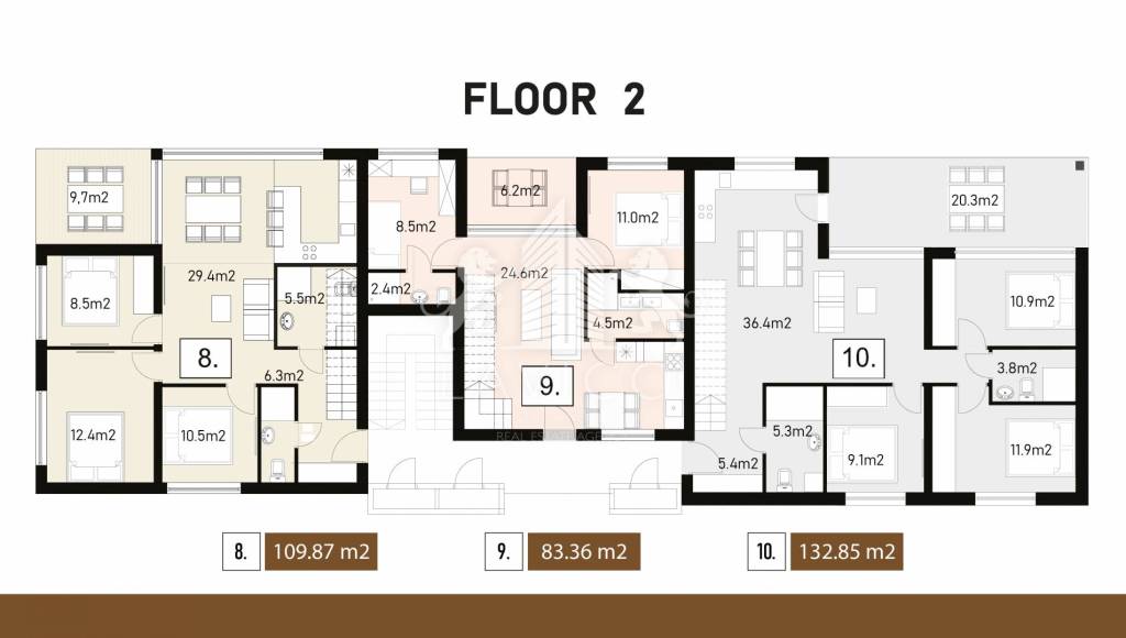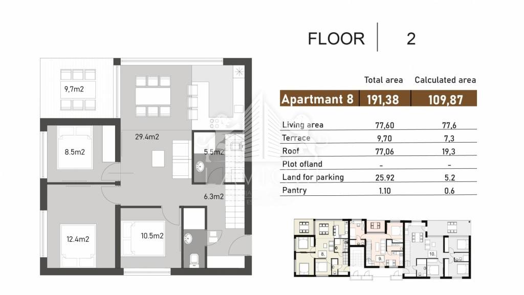 The apartment marked S-8 is located on the 2nd floor. The total floor area is 87.30m2, and consists of an entrance area (hallway), 3 bedrooms, a bathroom with toilet, a living area with a kitchen with a dining room and a living room, and a covered terrace. The internal staircase in the apartment leads to a covered roof terrace of 77m2. The terrace is planned to be equipped with a pergola and water, electricity and drainage installations.