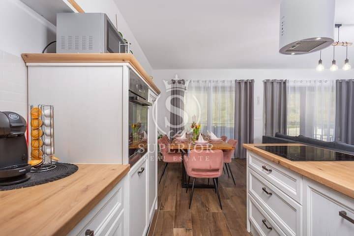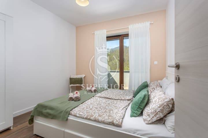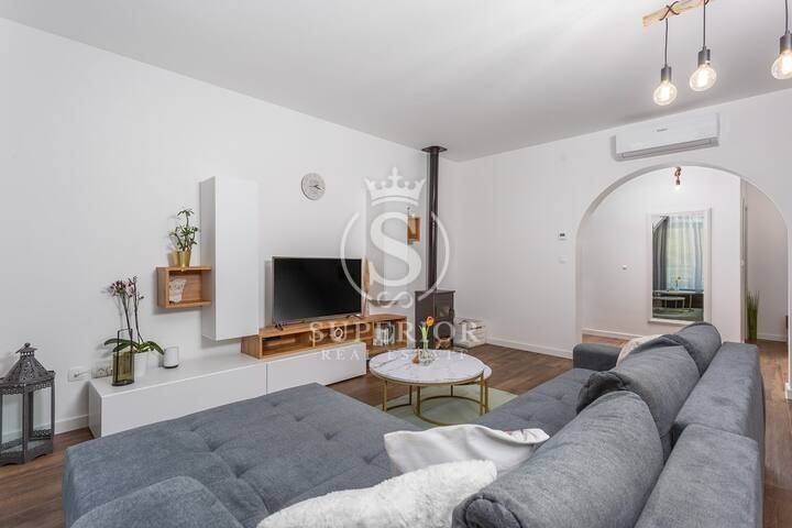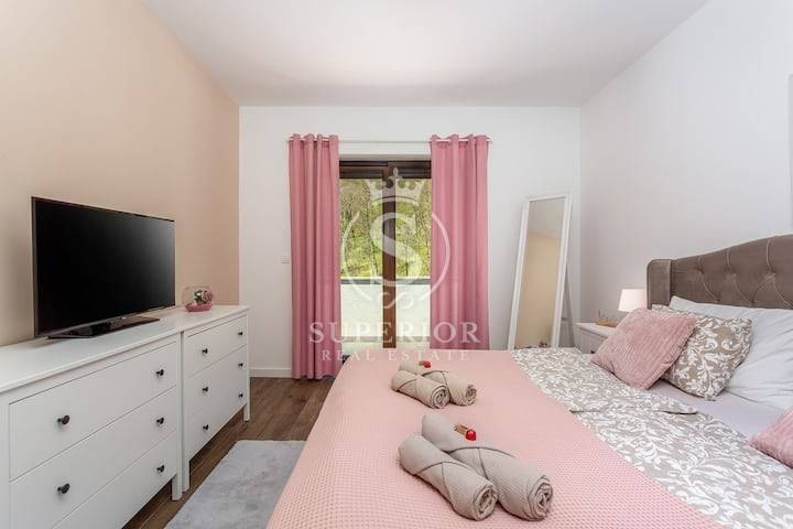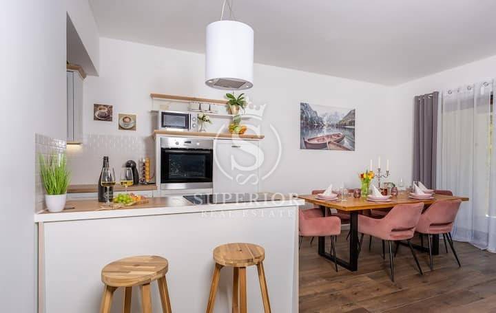 High above Opatija, where the air carries the scent of pine and sea breeze, lies the charming village of Veprinac. In this peaceful setting, where every view brings serenity, a modern duplex apartment and a separate studio are for sale – all within a semi-detached house with a pool.