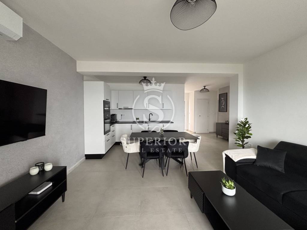 Situated on the first floor of a new residential building, the apartment comes with exclusive use of a 130 m² rooftop terrace with connections for a jacuzzi – the perfect setting for relaxation, gatherings and unforgettable sunsets.