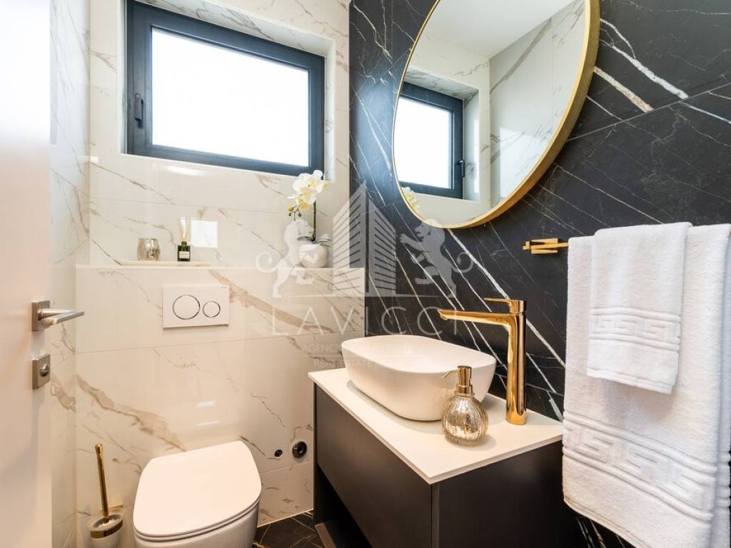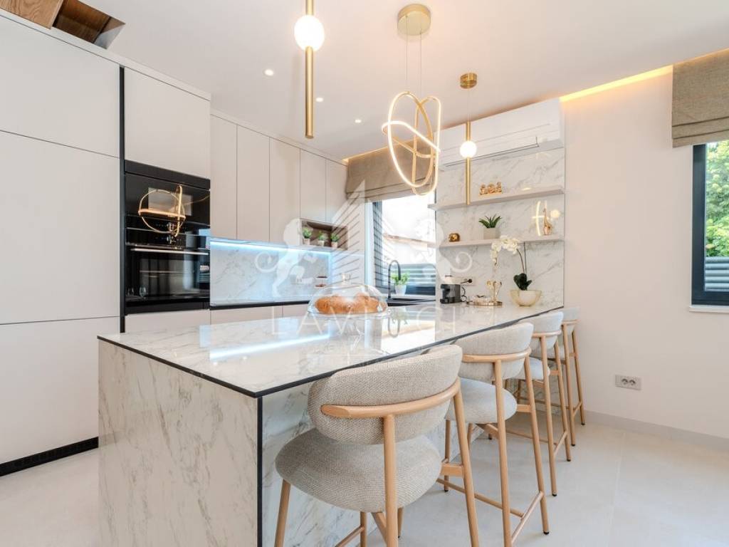Only the best materials were used in the construction. The construction is reinforced concrete. Styrofoam facades and aluminum joinery with 3-layer glass and mosquito nets were installed. Heating and cooling is carried out by means of a heat pump in all rooms. Underfloor heating is installed throughout the villa. First-class Italian ceramics were used for the floor coverings, while sanitary ware from the renowned manufacturer Hansgrohe was installed in the bathrooms and toilets.