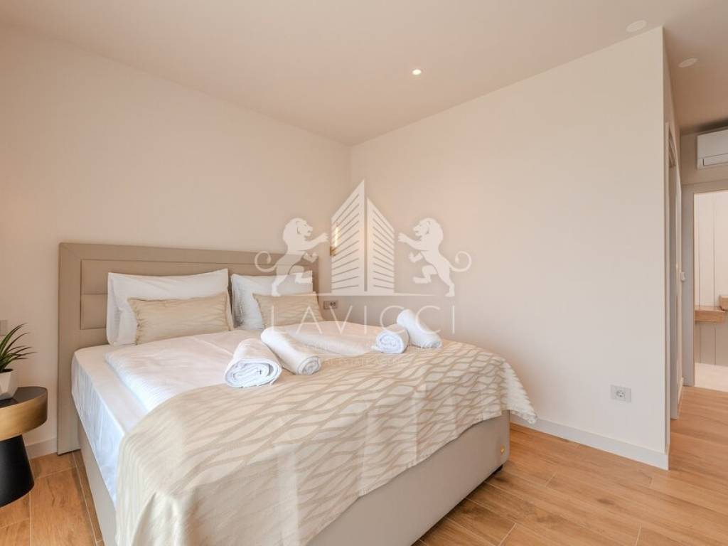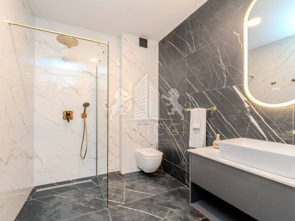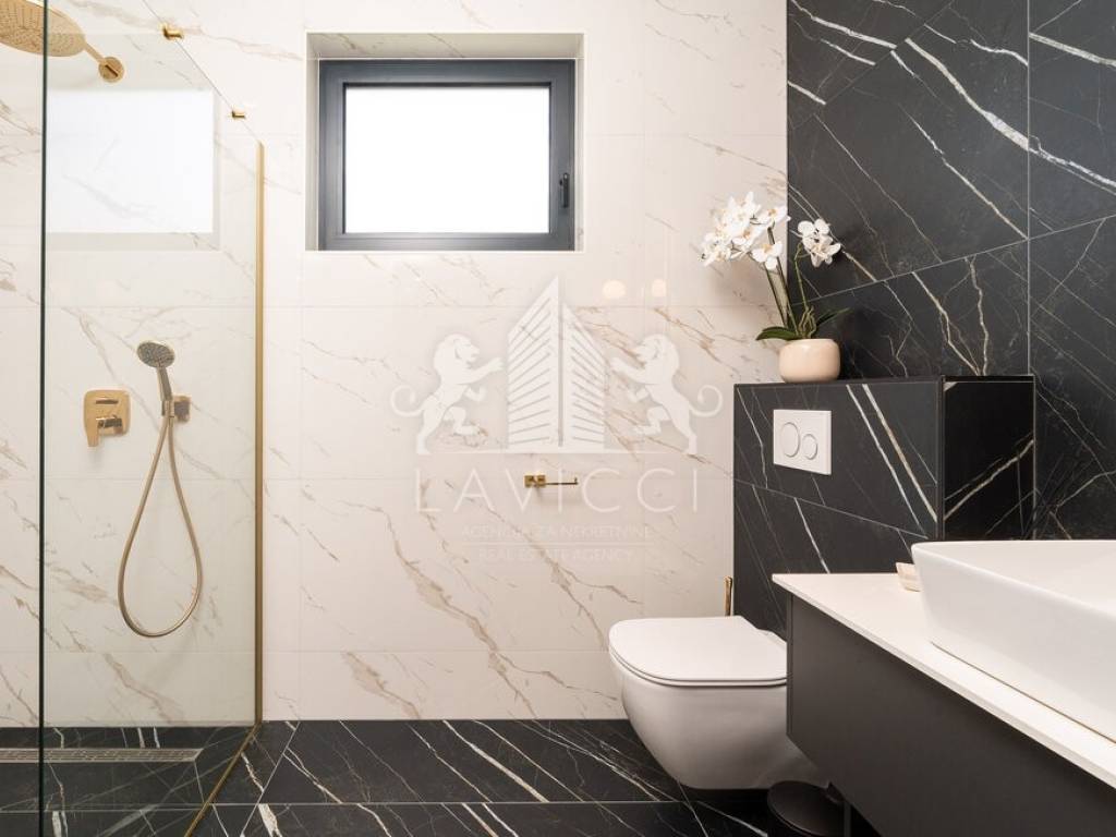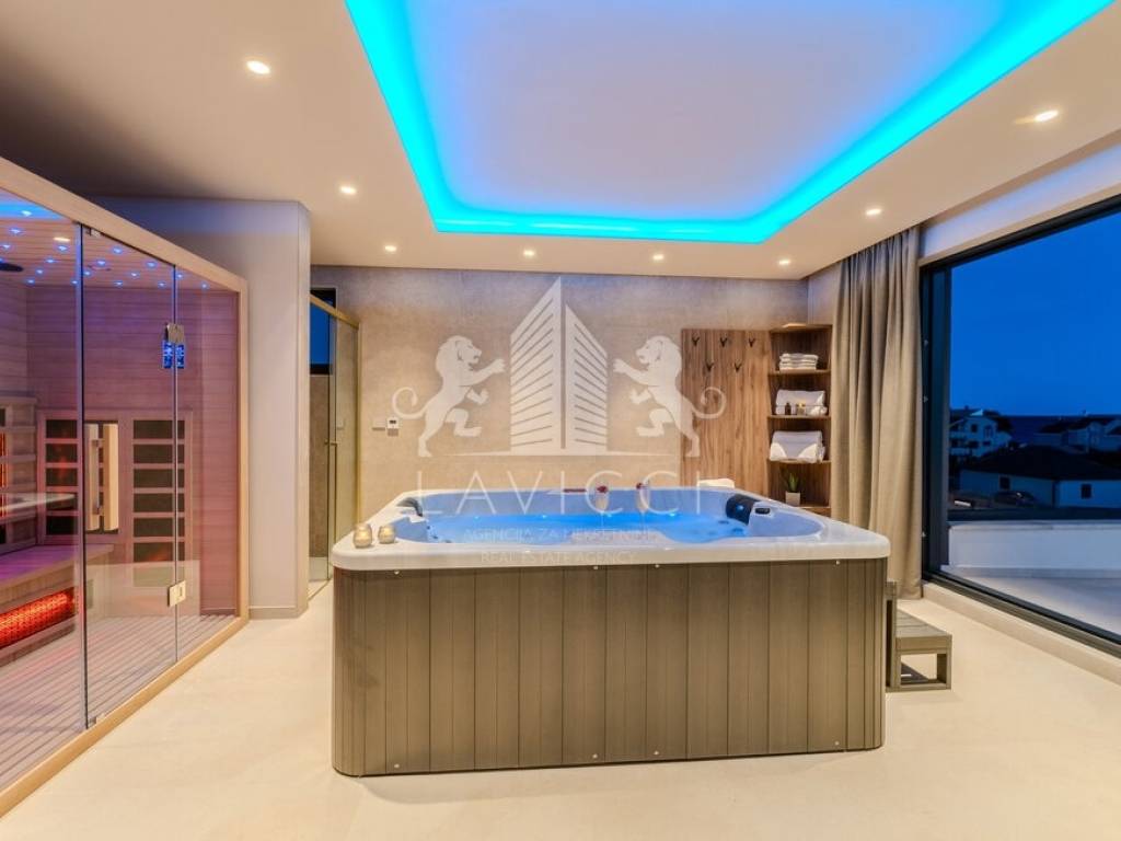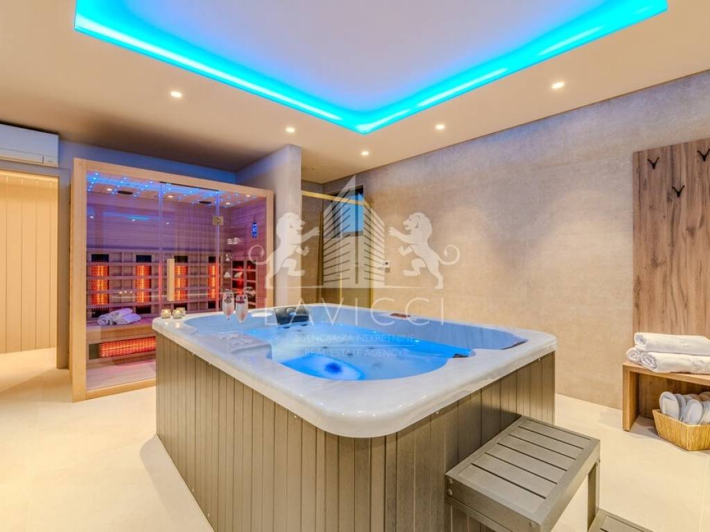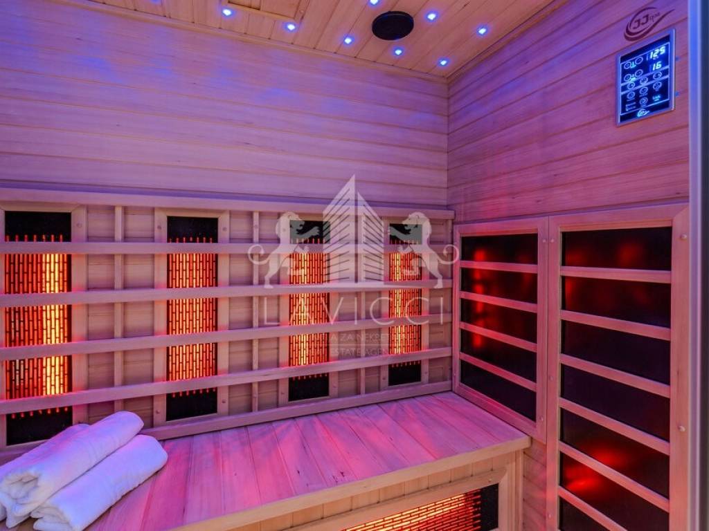 On the second floor there is a toilet, and the corridor leads to the lounge room, from which you enter the space for complete enjoyment and rest, which consists of an infrared sauna, a hydromassage tub (jacuzzi), a shower cabin and an exit to the roof terrace / sun deck with a wonderful view of the sea.