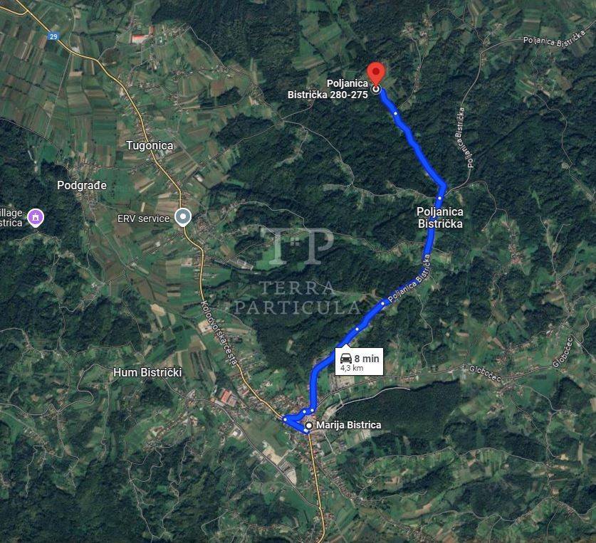 MARIJA BISTRICA, Poljanica Bistrička Na prodaju nudimo zemljište površine 3.949 m² od kojeg je cca je 2.870 m² u građevinskoj zoni. Nalazi se nasuprot kuće na adresi Poljanica Bistrička 282. Marija Bistrica, cca 4,5 km udaljeno od centra Marije Bistrice. Vlasništvo zemljišta je čisto, bez tereta. Cijena: 15.000 € 098 251 701