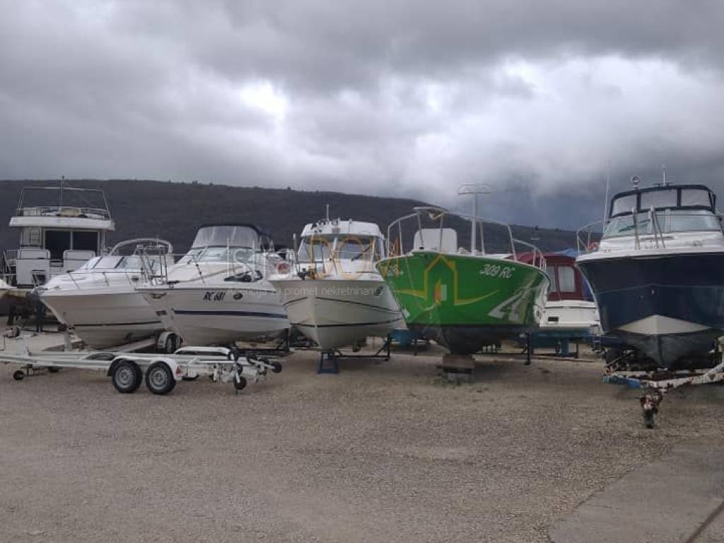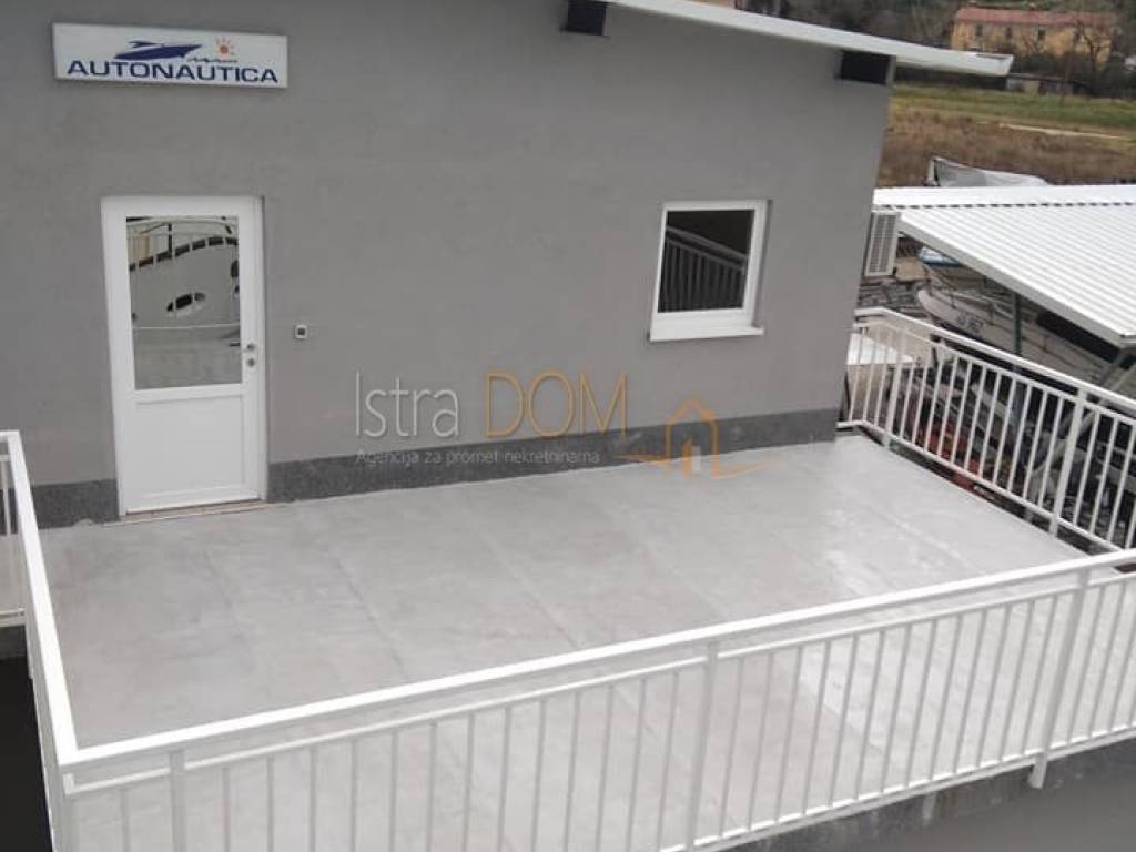Kompletna nekretnina je ograđena djelomično betonskim zidom i žicom visine 2 metra a djelomično samo žicom visine 2 metra. Dio koji je ograđen samo žicom je moguće proširiti za još 2200m2 za koje zemljište je postupak otkupa od Republike Hrvatske o tijeku. Glavni ulaz je širine 11 metara tako da nesmetano može ući veći kamion, labudica ili dizalica, odmah sa ulaza je mjesto namijenjeno za izlaganje proizvoda i parkirna mjesta za kupce i djelatnike, sa desne strane od ulaza je još jedan odvojeni zatvoreni ulaz za vozila koji vodi u skladišni otvoreni ograđeni prostor sa slobodnim prolazom pješice sa strane upravne zgrade. Sjeverno uz upravnu zgradu je uređena betonska površina sa odvodnim kanalom koja služi za pranje, u produžetku, prema istoku uz upravnu zgradu je obnovljena nadstrešnica visine 4,5 metara površine 430m2 koja se može iskoristiti za razne namjene. Samo zemljište dozvoljava proširenje objekta za još oko 1000m2 bez traženja dodatnih dozvola. Upravna zgrada je tlocrtne površine oko 120m2, visine 6.5 metara, ulaz u radionički prostor je kroz sekciona vrata veličine 4.5x4.5 metara uz odvojeni ulaz za pješake. radiona je dužine 10 met sa pripremom za ugradnju mosne dizalice, u nastavku radione se nalazi sanitarni čvor, garderoba i tuš. Sa vanjske južne strane upravne zgrade se nalazi stepenište koje vodi na otvorenu terasu veličine 20m2 na kojoj se nalazi ulaz u hodnik, dva odvojena ureda i sanitarni čvor, glavni ured ima dva prozora od kojih jedan prema radioni. Nekretnina je namjenski obnovljena u zadnjih 5 godina, pvc stolarija, stiropor fasada, ograde, unutarnja i vanjska keramika, krov, instalacije struje i vode, klima uređaji, centralno grijanje radione i ureda, vanjska led rasvjeta, video nadzor vanjskog dijela nekretnine , 8 kamera, 19 vanjskih priključaka struje, 9 vanjskih priključaka vode, grijana voda u prostorijama upravne zgrade. ulazna vrata na daljinski... i trenutno se koristi kao suha marina- odlagalište plovnih objekata sa kapacitetom od oko 80-100 mjesta, te je kao takva 2020 godine kategorizirana od strane Istarske županije. Zbog neposredne blizine mora na nekretnini posluje tvrtka vlasnika nekretnine sa svom opremom potrebnom za obavljanje djelatnosti čuvanja plovila, dvije autodizalice sa opremom, vozila za prijevoz plovila, metalne ležaljke za plovila, viličar. Nekretnina se prodaje zajedno sa uhodanim poslom i tvrtkom za cijenu od 800 000€, kupnja je moguća i bez tvrtke.