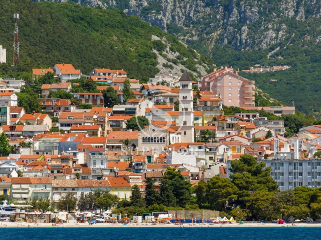 The property includes an additional land plot of 1200 m², ideal for landscaping, extra parking, a sunbathing area, or building a swimming pool. On the plot there are two garages and a covered parking space. In front of the house is a terrace with an open sea view – a perfect place to relax.
