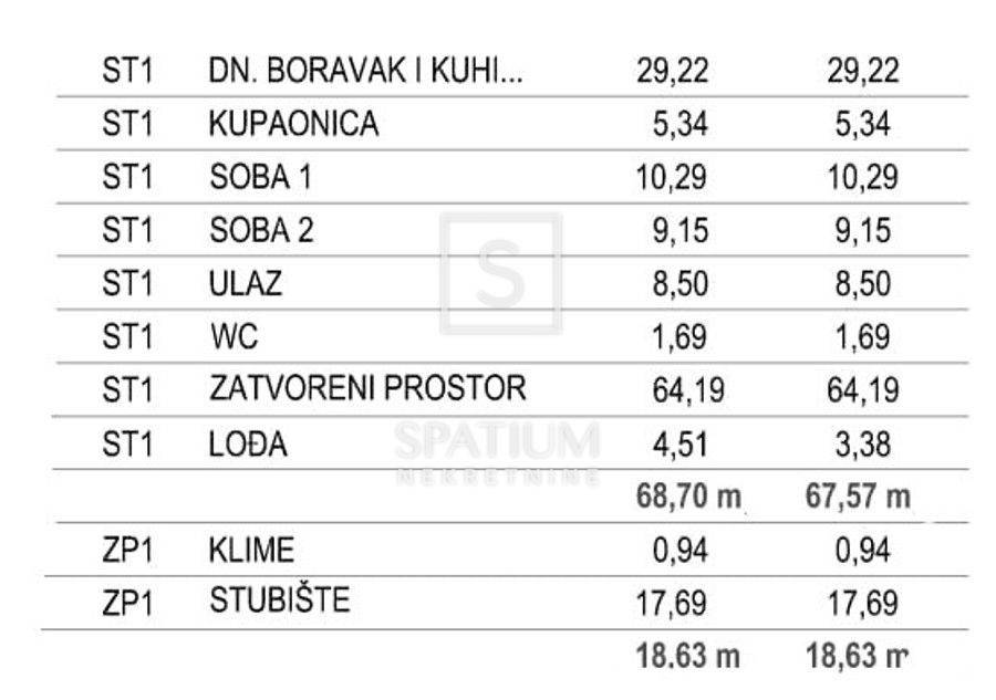 The apartment has a total area of 68.70 m², with 67.57 m² of calculated usable space, and consists of a spacious living room with kitchen and dining area, two bedrooms, a bathroom, a separate WC, an entrance hall, and a 4.51 m² loggia that further enhances the living space and offers the possibility of relaxing outdoors.