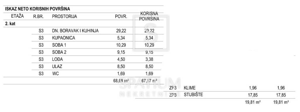 The apartment has a total area of 68.69 m², with a calculated net usable area of 67.57 m². It consists of a spacious open-plan living room with kitchen and dining area, two comfortable bedrooms, a bathroom, a separate guest toilet, and an entrance hall. A covered loggia of 4.50 m² adds extra value – perfect for relaxing and enjoying sea views.