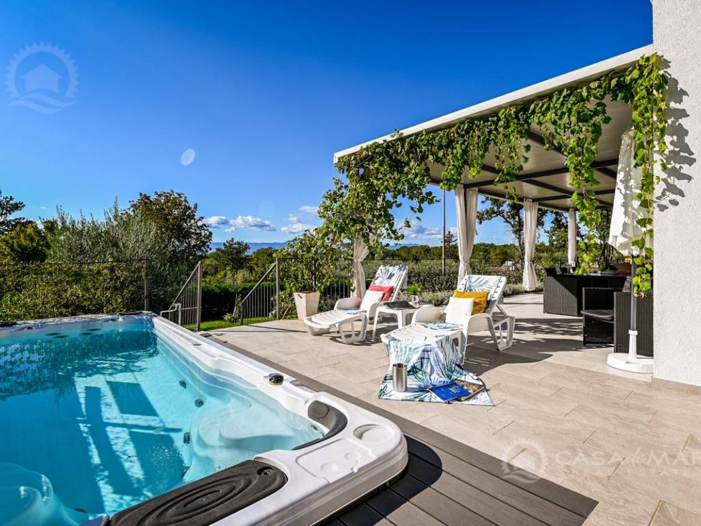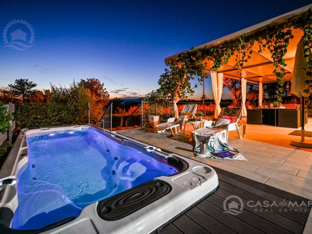 As part of the garden, there is also a 6-meter swim-spa pool with counter-current swimming and a jacuzzi, as well as a garden grill and a garden house.