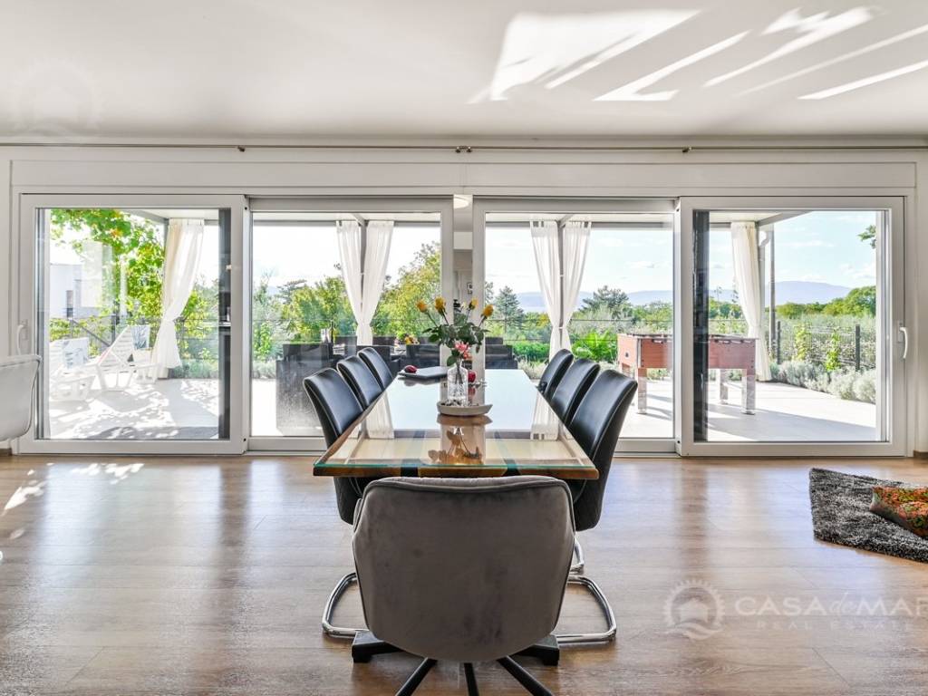 This unique villa has a lot of natural light due to large glass walls and modern, bright floor coverings.