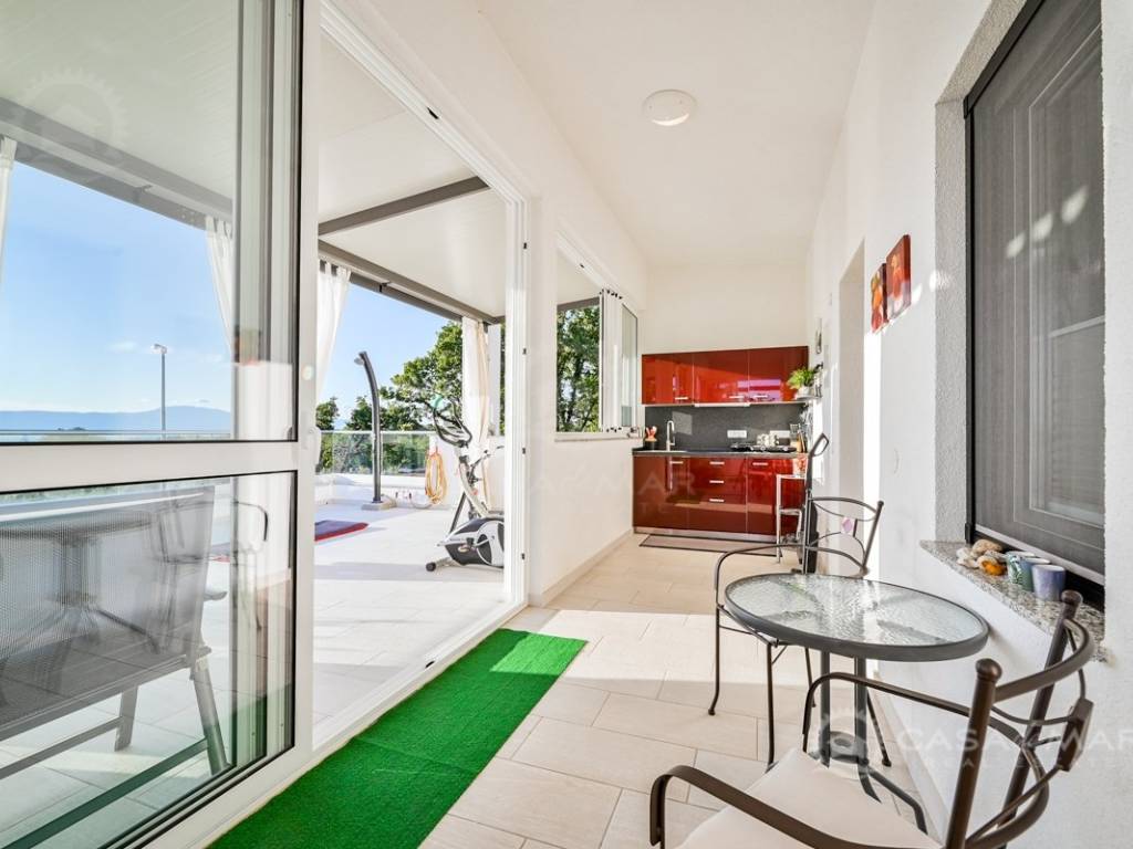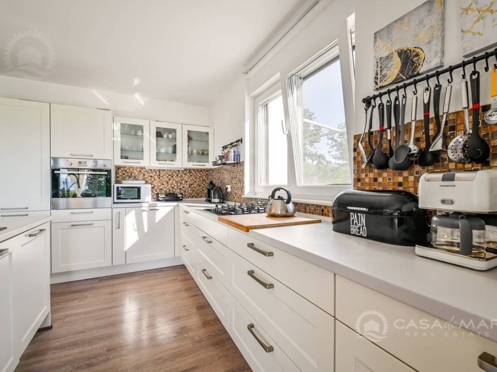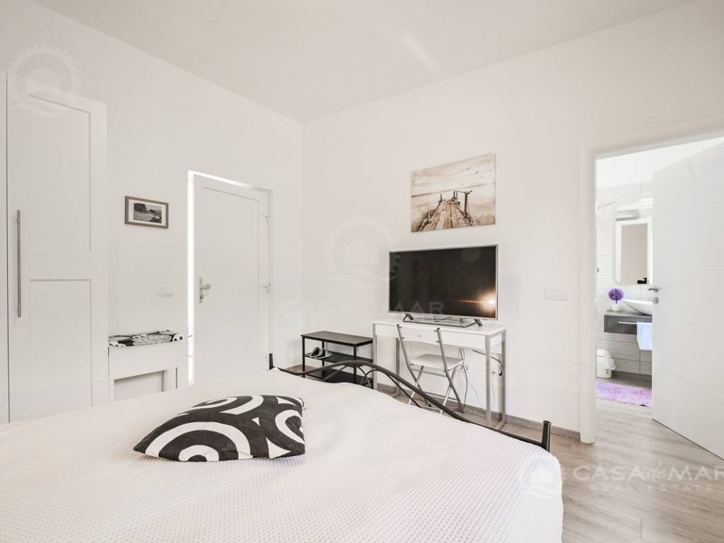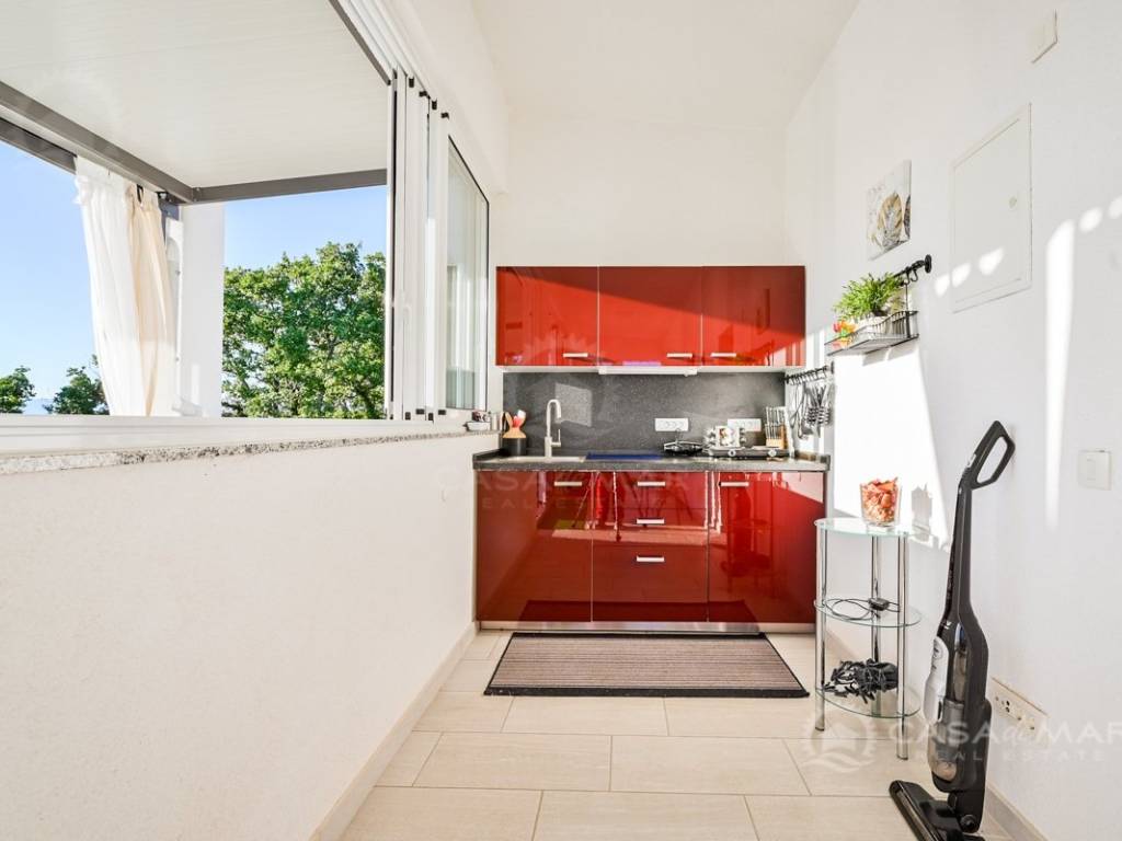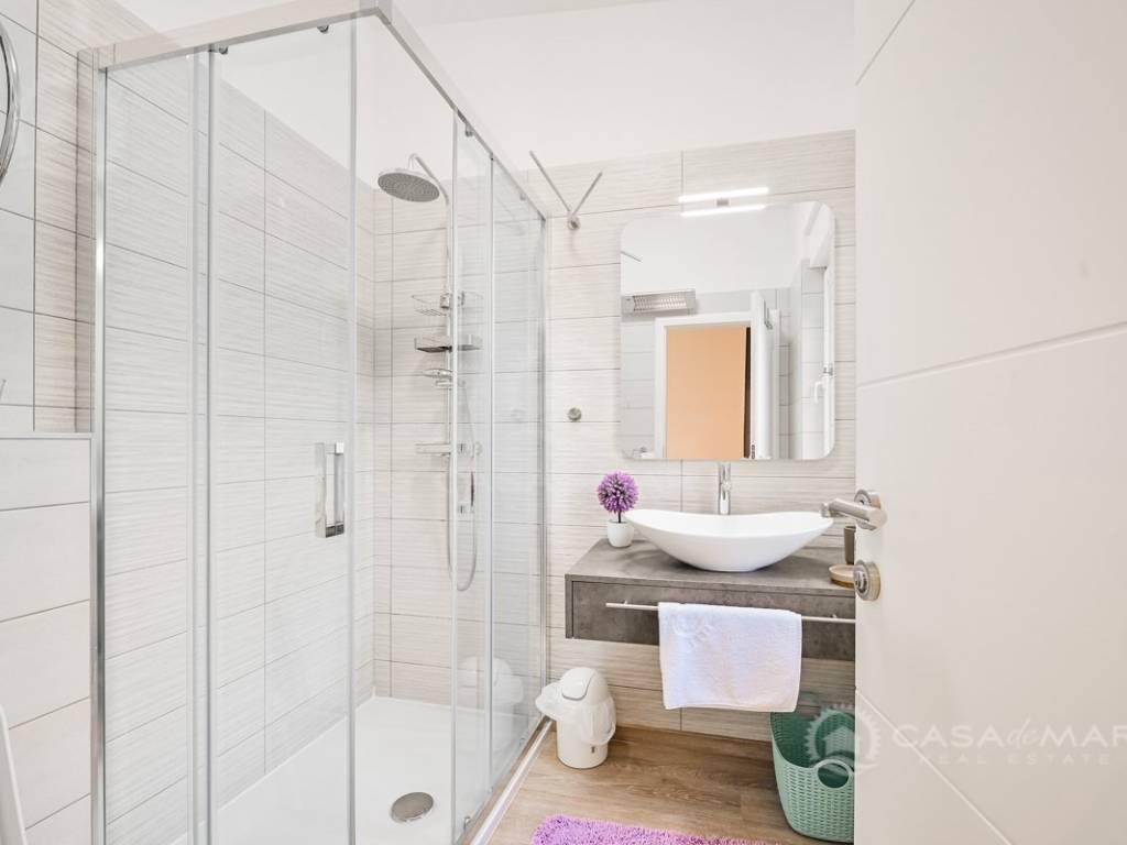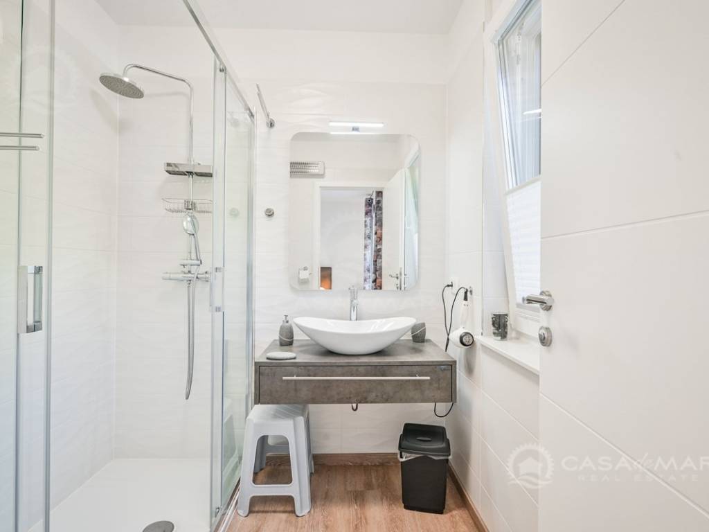 On the first floor there is a small kitchen, from which you can go out to a partially covered terrace with a seaview, two bedrooms, each with its own bathroom.