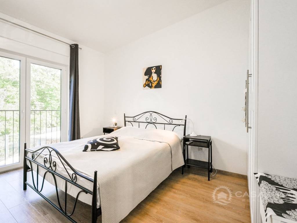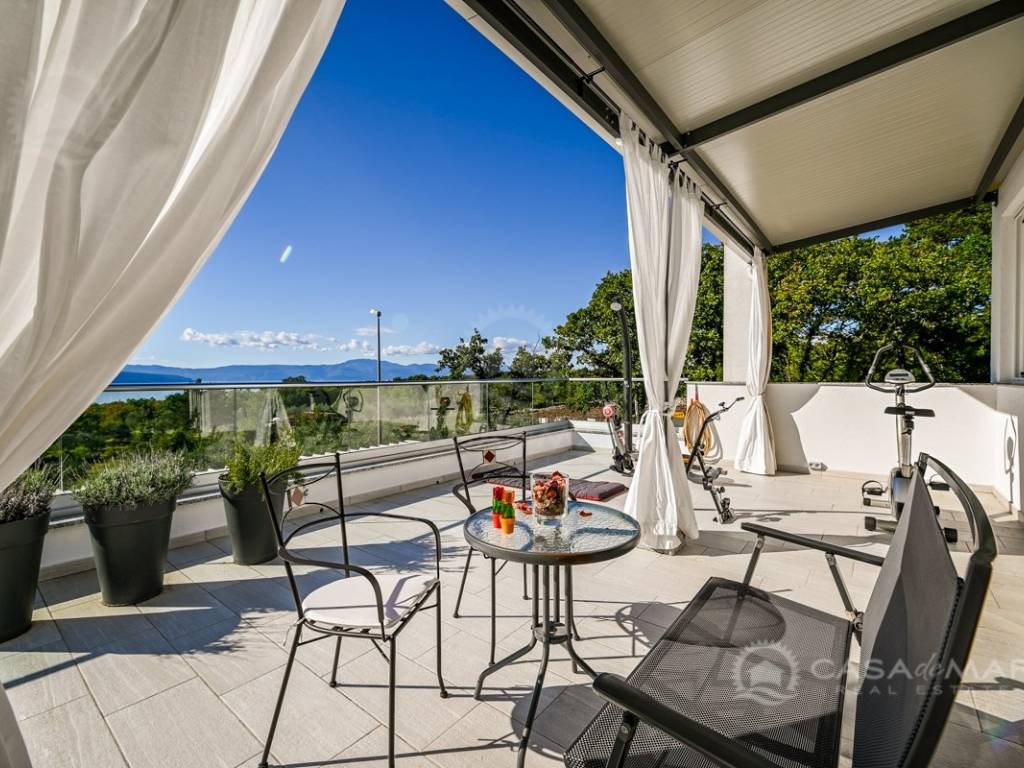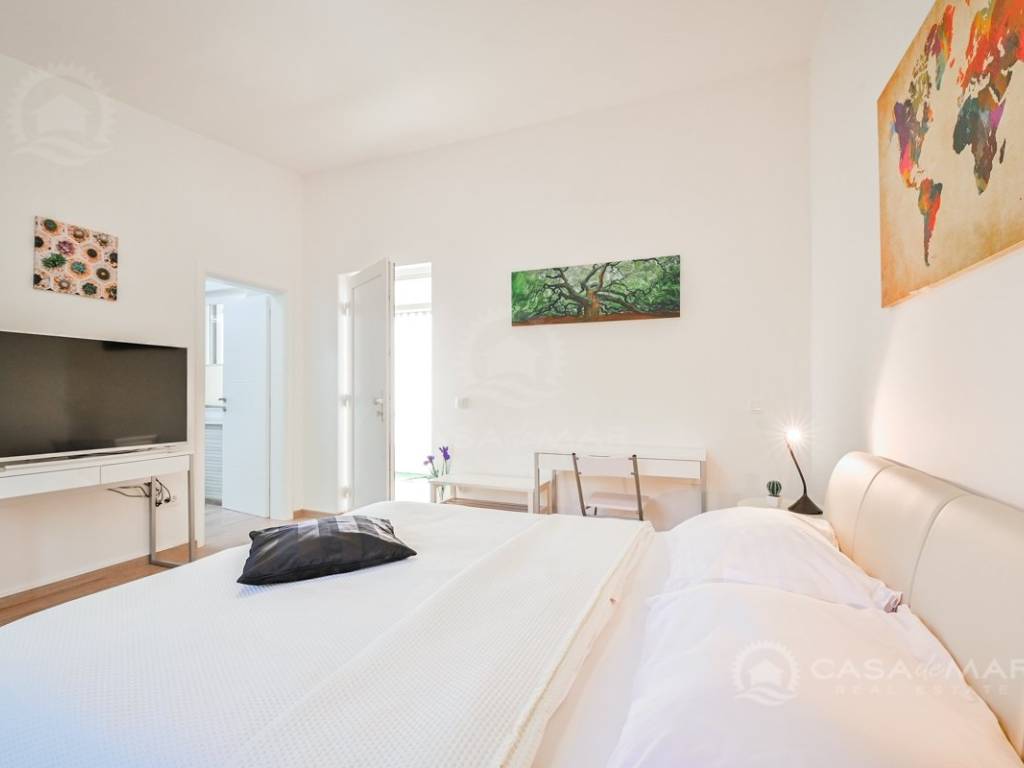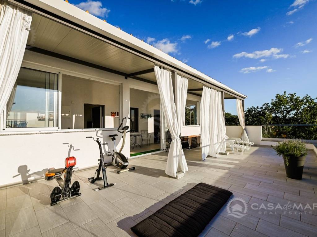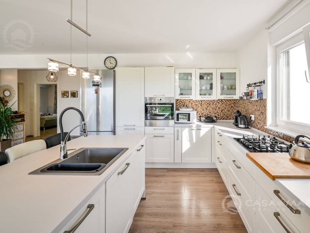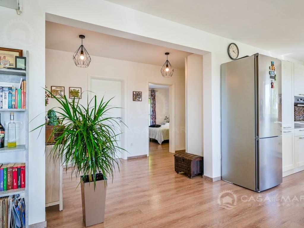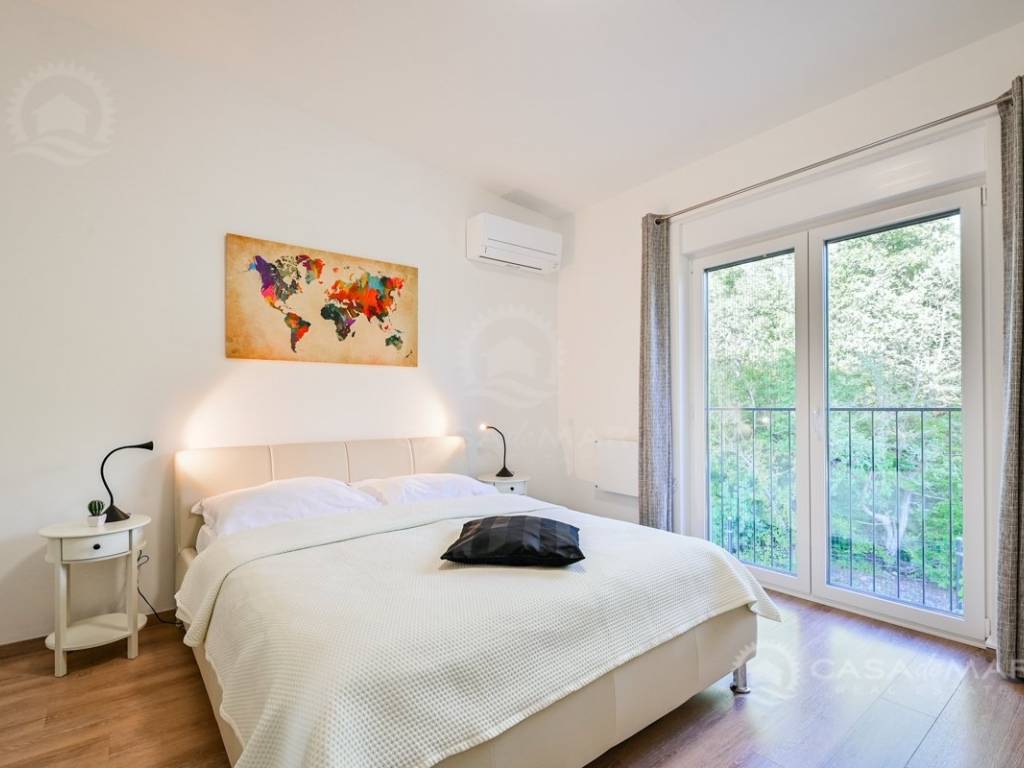 On the first floor there is a small kitchen, from which you can go out to a partially covered terrace with a seaview, two bedrooms, each with its own bathroom.