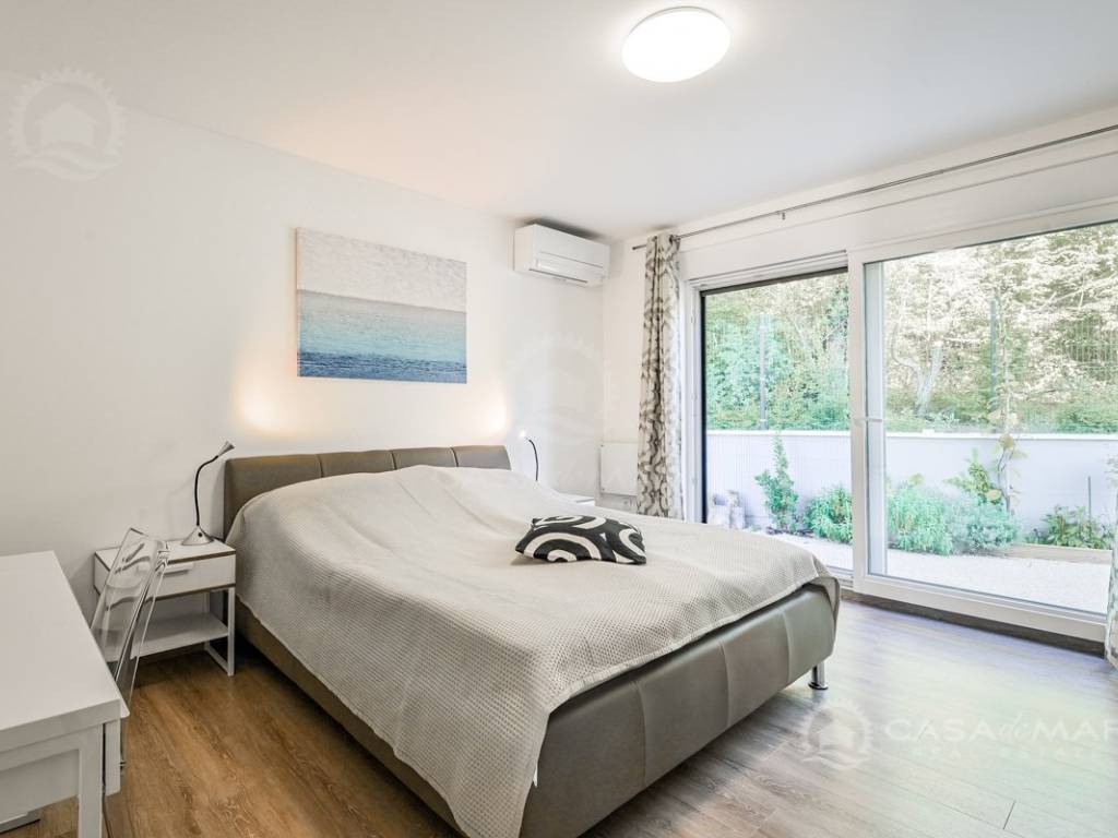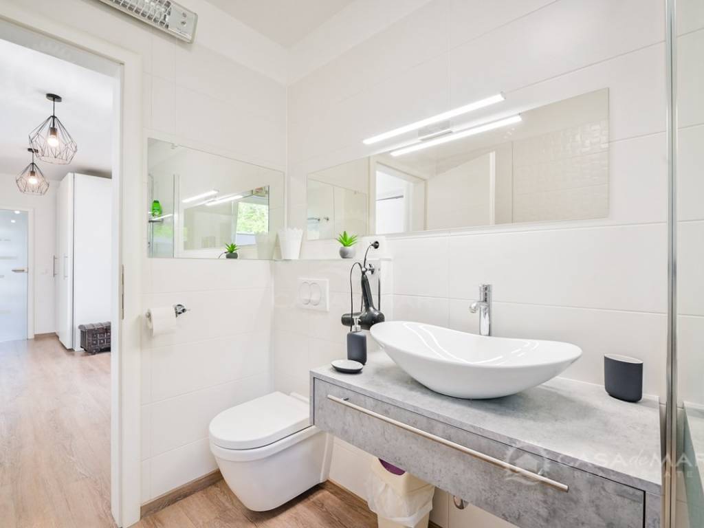 The ground floor is designed as an open-space space consisting of a living room, a modern kitchen and a dining room, from which you can exit to a covered terrace. On the ground floor there is also a guest toilet, two bedrooms, each with its own bathroom and access to the spacious garden.