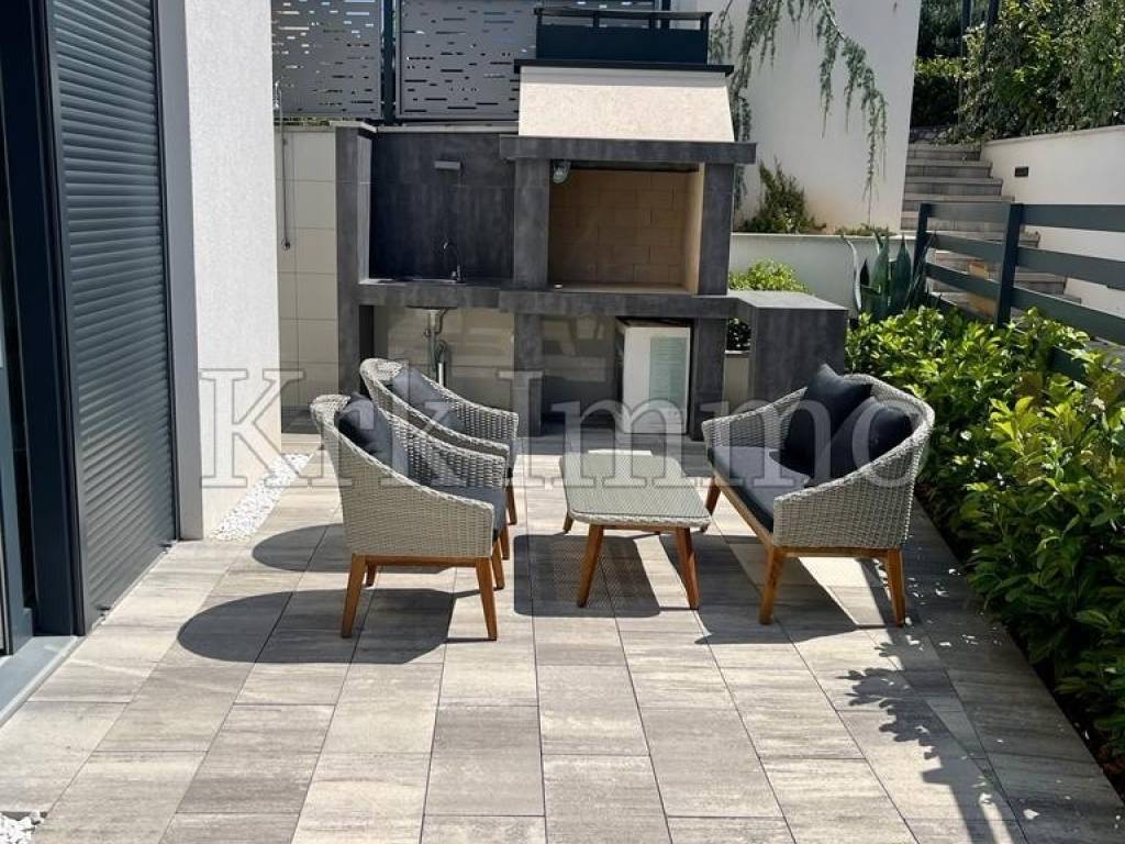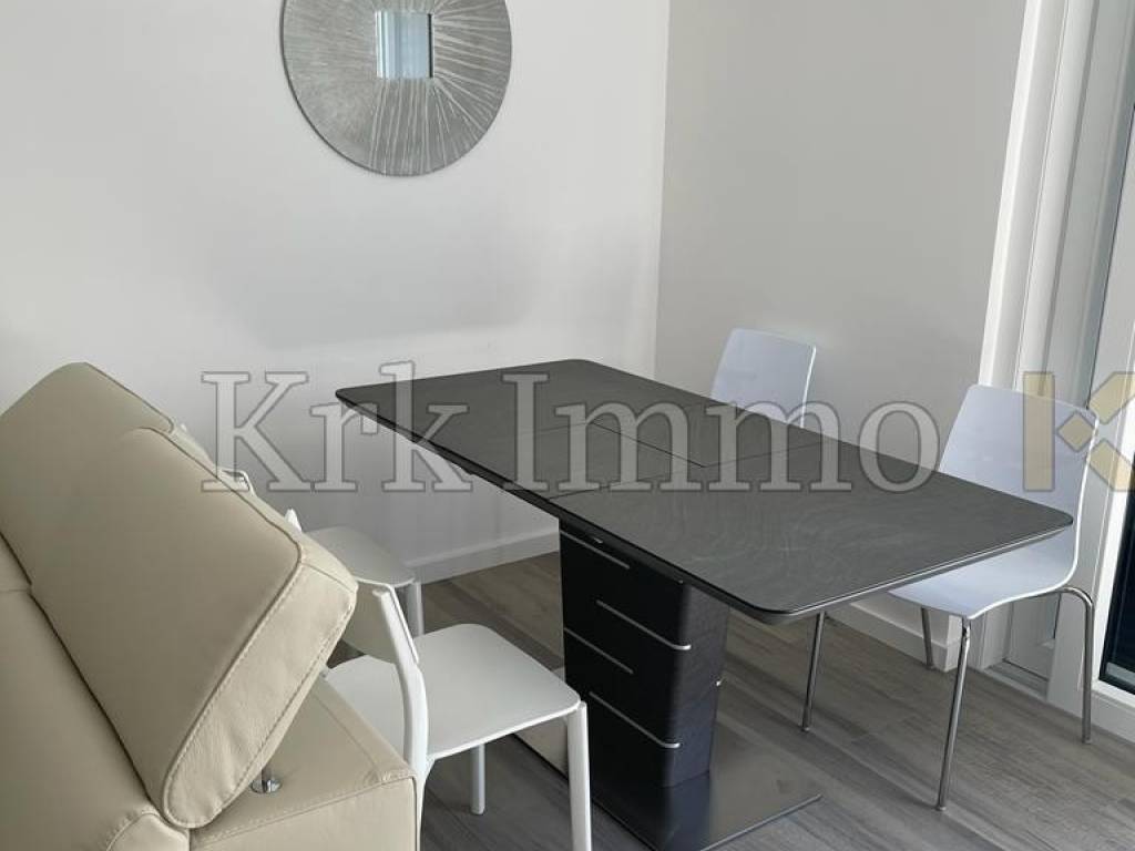 For sale is a new luxury apartment on the first floor of a residential building located in the town of Krk, in an excellent location only 300 m from the sea. The apartment has a total living area of 98 m2, and consists of a hallway, three bedrooms, each with its own bathroom, toilet, and kitchen with dining room and living room. The kitchen and living room also have access to a covered terrace of 16 m2.