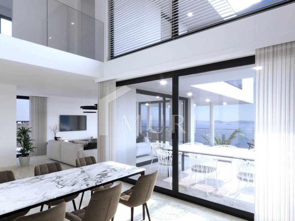 • The upper floor includes three bedrooms, each with its own bathroom. The master bedroom has access to a loggia with a stunning view, providing complete comfort and privacy.
