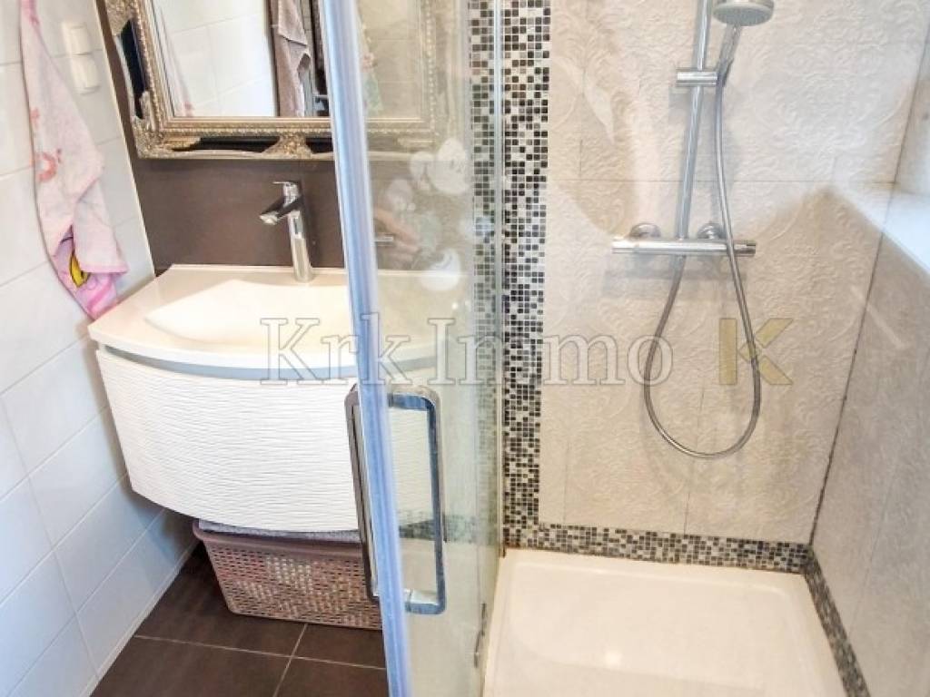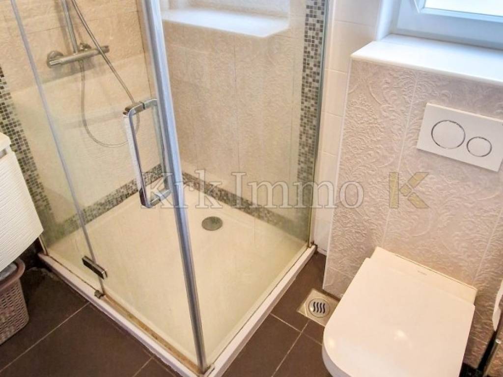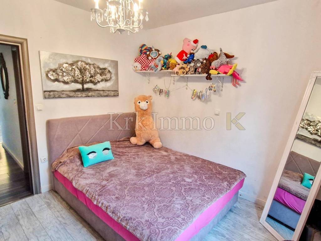 For sale is a modern apartment in a quiet part of the town of Krk, only 500 meters from the coast and the city center. The apartment has a total area of 55 m2 and is located on the ground floor of a multi-family building.