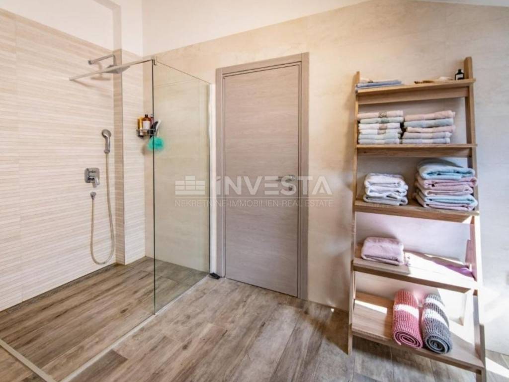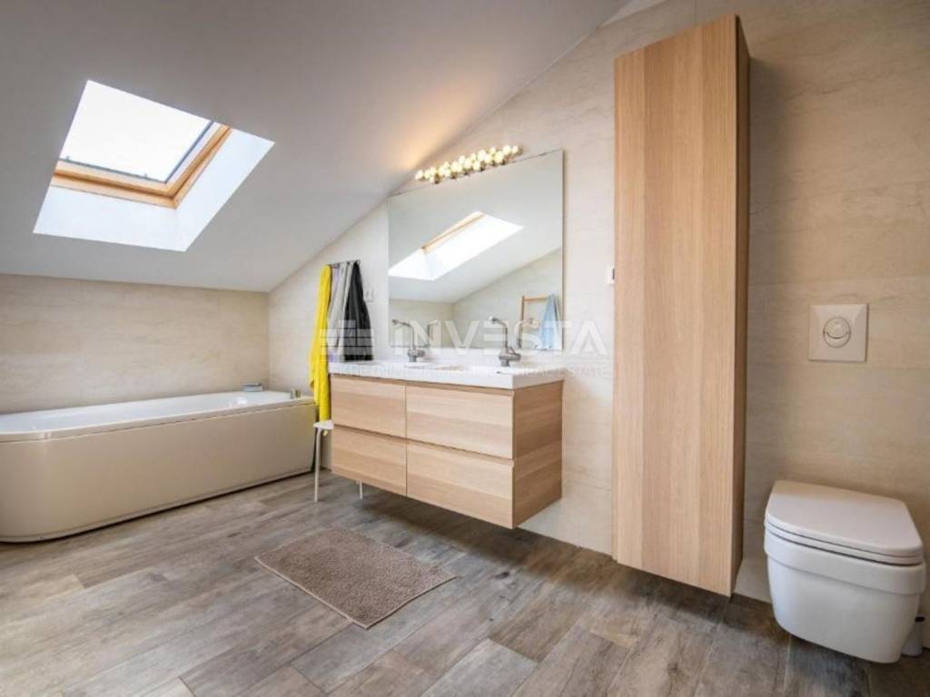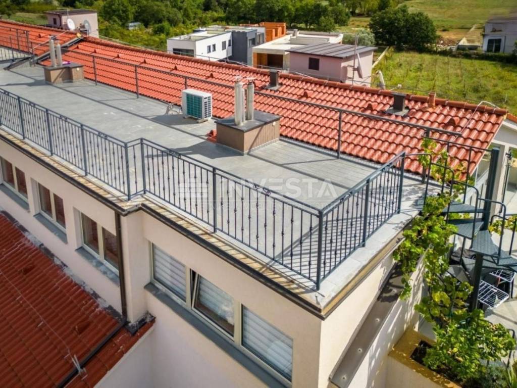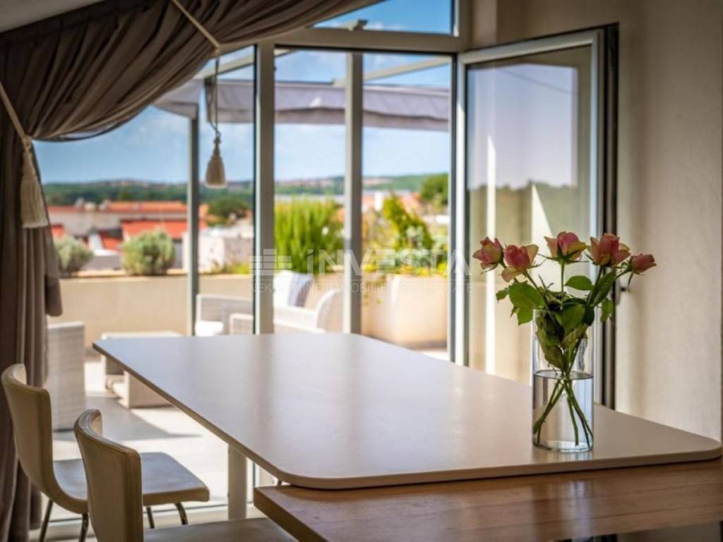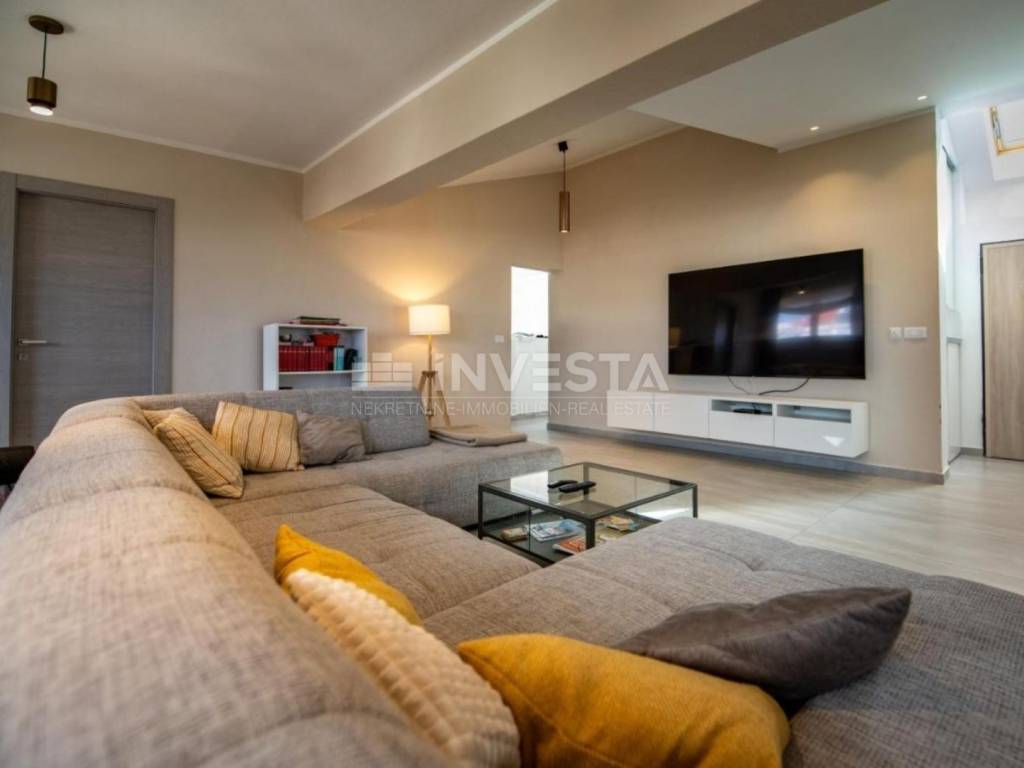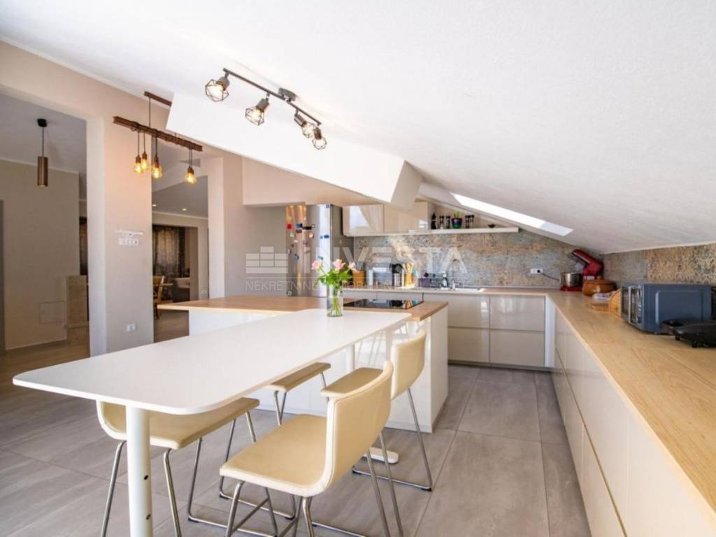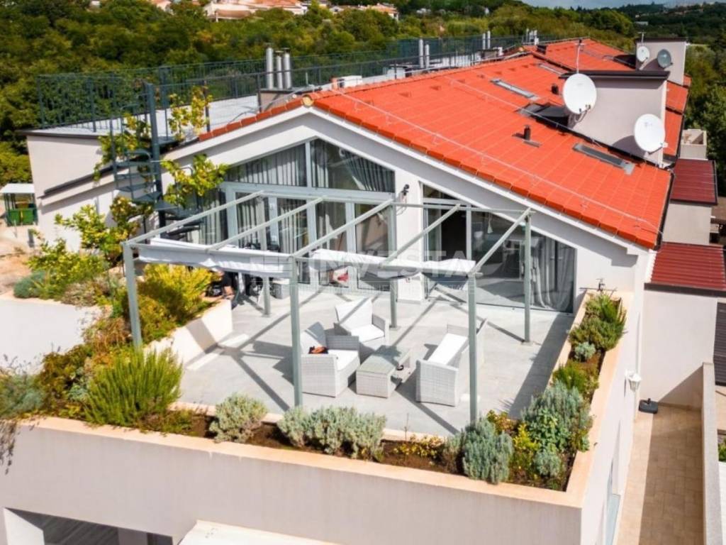 Medulin, unique penthouse 230m2 with sea view. In a sought-after location in Medulin, a modern two-level penthouse with a net usable area of 230 m2 is for sale, featuring a spacious terrace and an additional rooftop terrace with a sea view.