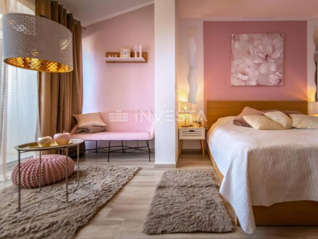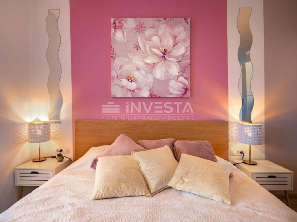 The first level of the apartment consists of three bedrooms and a bathroom, while the second level features two additional bedrooms, a room used as a walk-in closet, a bathroom, and a spacious open space living room with a kitchen and dining area that leads to a large terrace with access to the rooftop terrace. The rooftop terrace offers panoramic views of the sea and the entire Medulin.