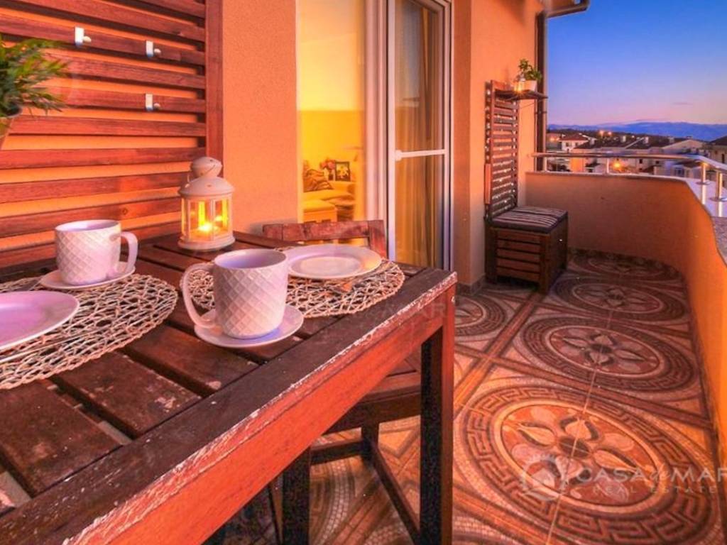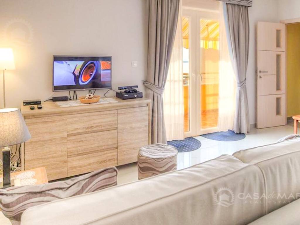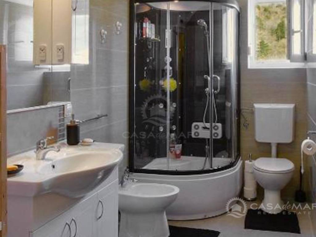 It also has a garage space in front of which you can park an additional car and a 68m2 garden which is in the final stage of landscaping. It consists of a brick barbecue area with a bar and a paved area for a jacuzzi and a pergola.