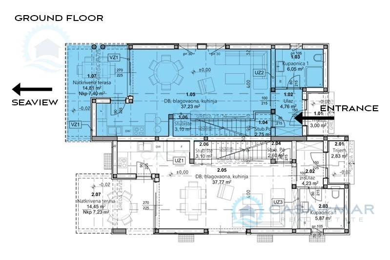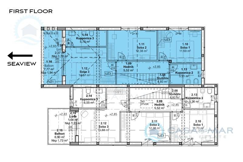 There are three bedrooms on the first floor, one of which has its own bathroom and access to the terrace, and one shared bathroom. There is a view of the sea from the bedroom terrace.