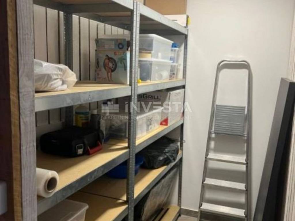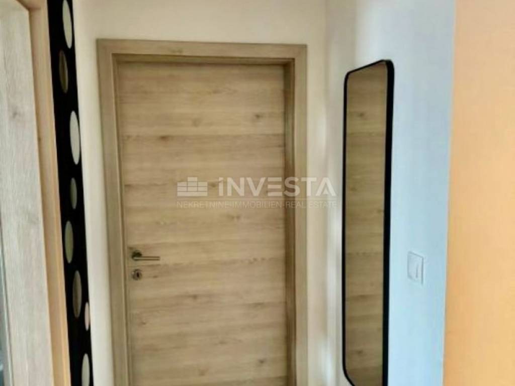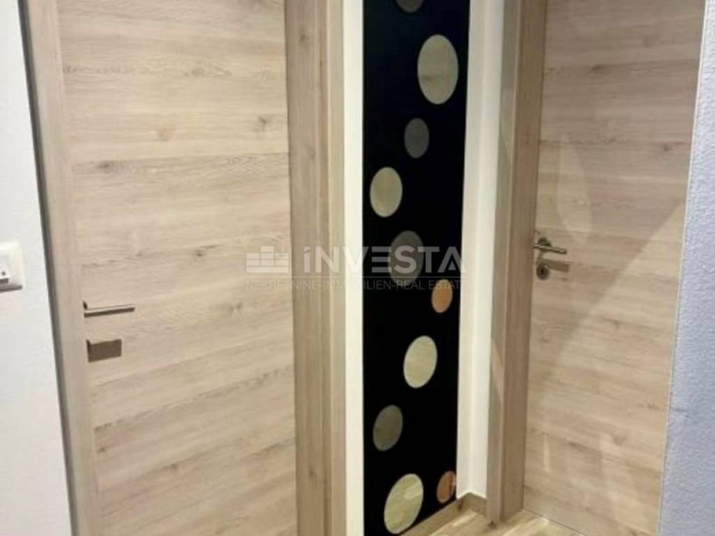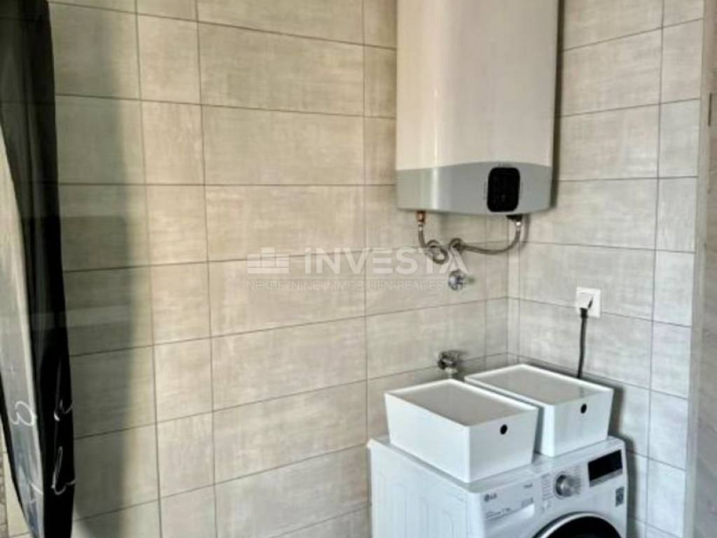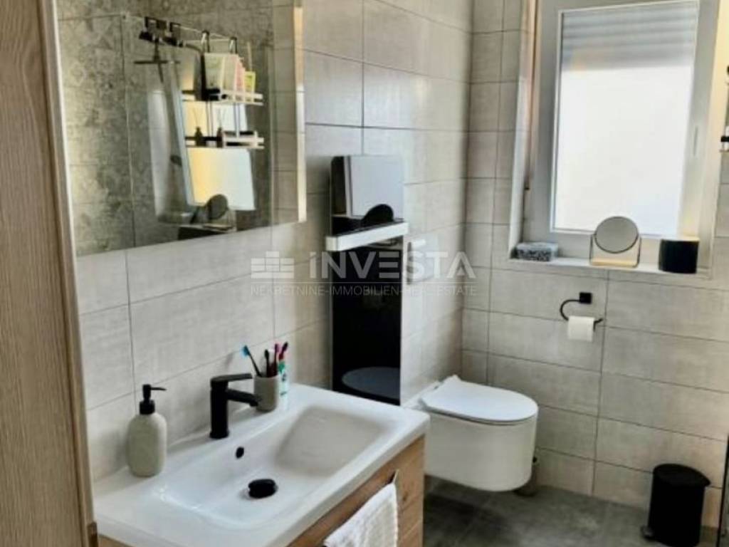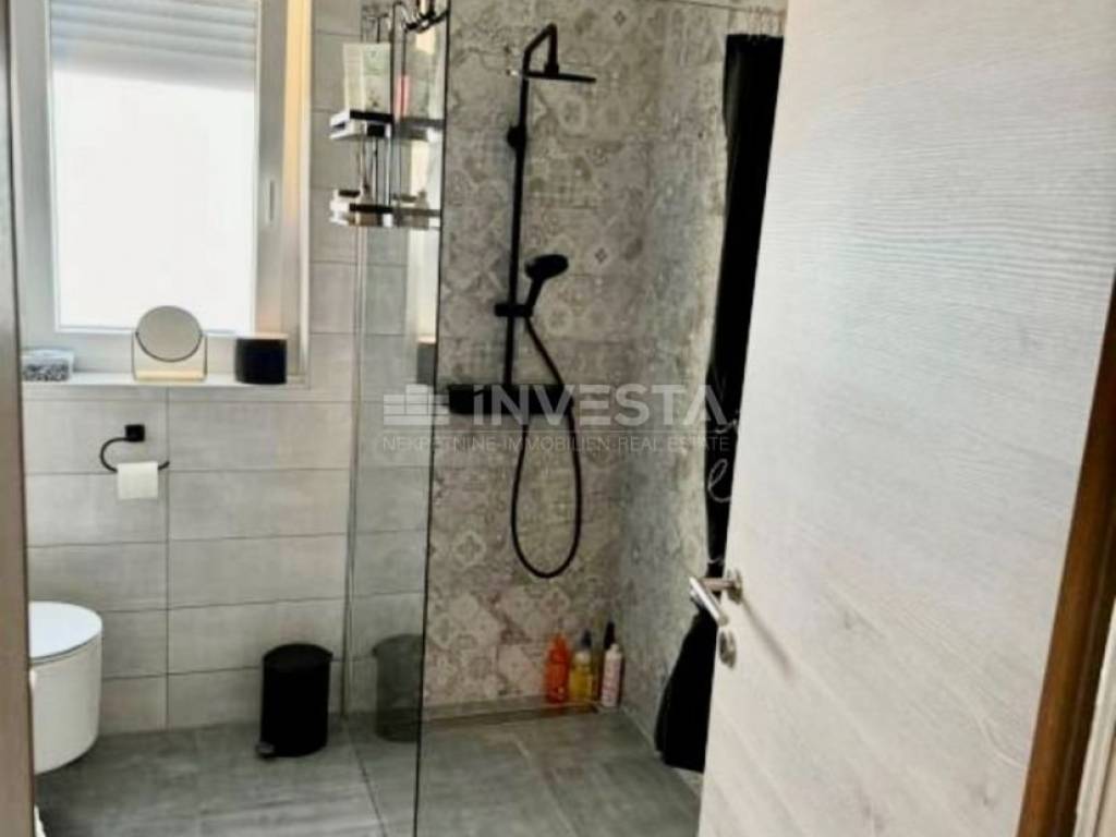 The apartment is located on the second floor of a smaller residential building in an attractive part of Medulin. With a total net usable area of 63 m², it consists of an entrance hallway, bathroom, two bedrooms, and an open-space living area with a kitchen and dining room, leading out to a spacious balcony. The apartment includes an outdoor parking space and a storage unit in the building's ground floor, providing additional storage space. It is modernly equipped with a stylish kitchen made of real wood, induction cooktop, high-end oven, hood, and dishwasher. The bathroom is equipped with a washer and dryer. Heating in all rooms is provided by infrared panels and designer heating units shaped like art pieces, while an air conditioning unit cools and heats the entire apartment.