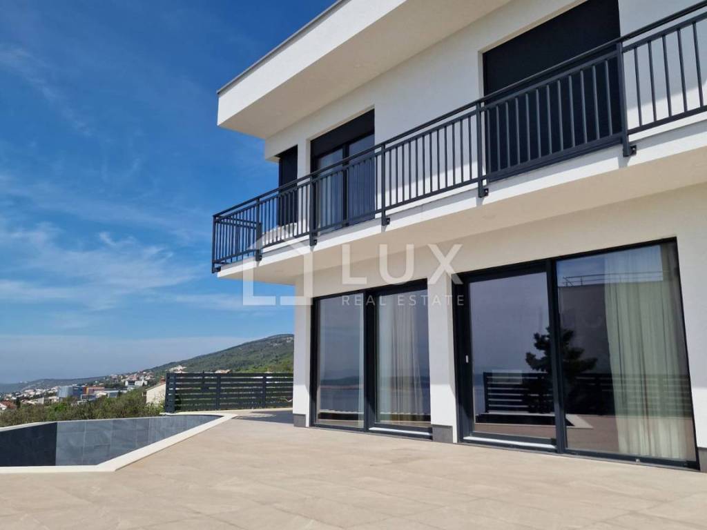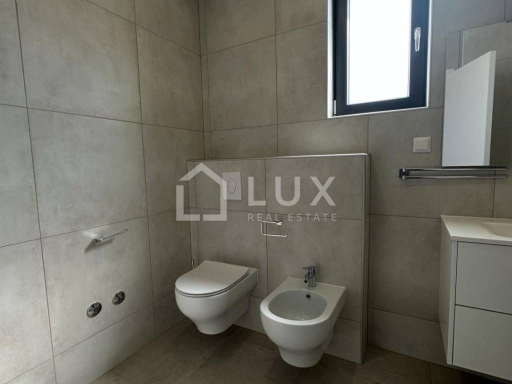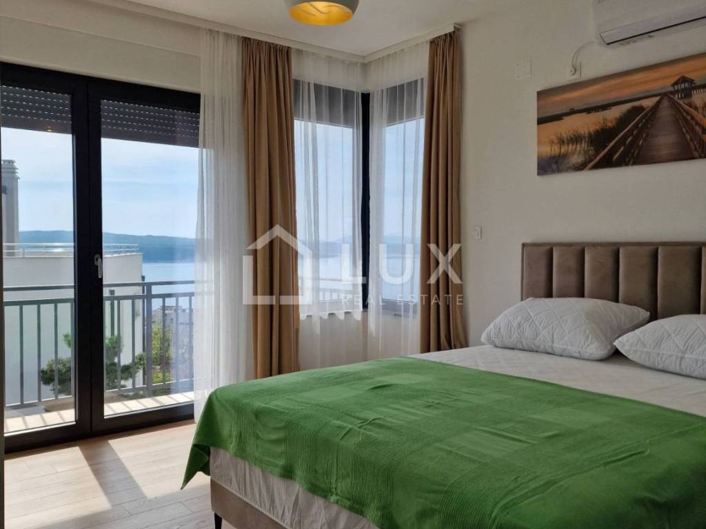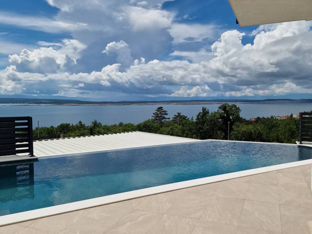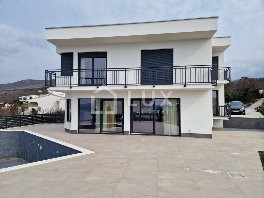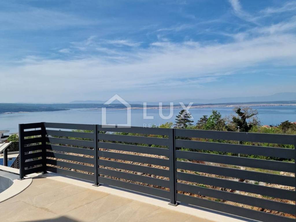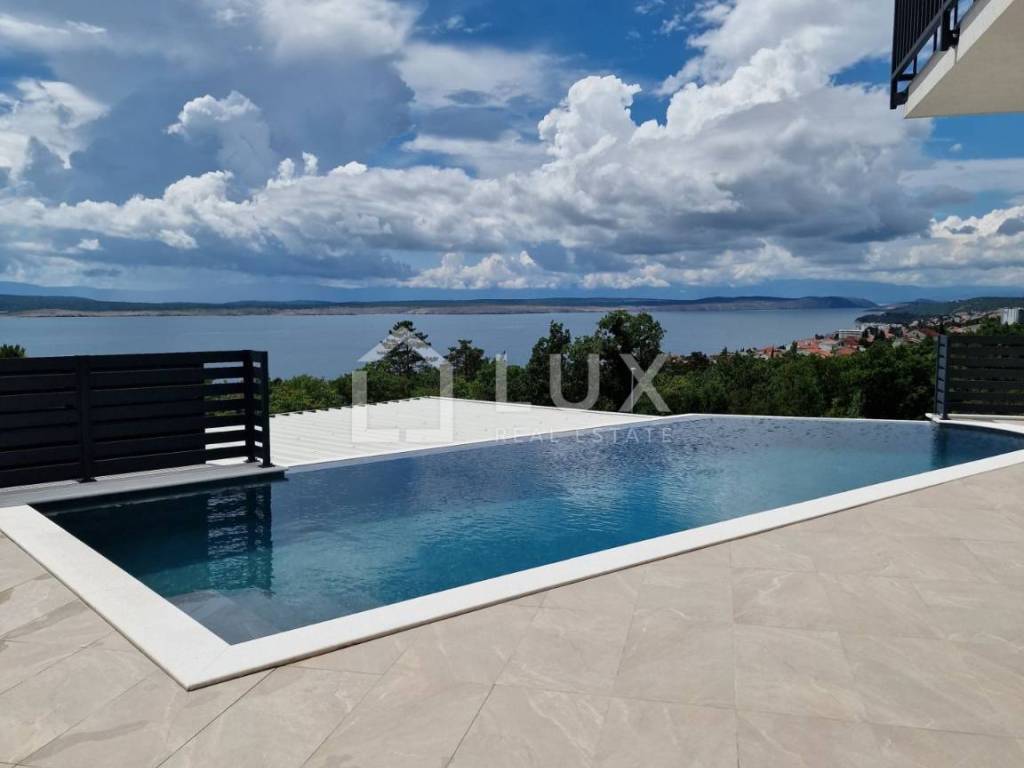 It consists of a ground floor and a first floor, interconnected by an internal staircase. Each floor offers a magnificent view of the sea and the island of Krk. On the ground floor there is a hallway, a kitchen with a dining room, a living room, a guest toilet, and one bedroom with a bathroom. Upstairs there are four bedrooms, each with its own bathroom, as well as a storage room and a laundry room. Upstairs there is also a terrace across the entire width of the villa. From the living room on the ground floor there is access to the covered terrace, directly connected to the sunbathing area next to the infinity pool with a beautiful view of the sea. The villa is also decorated with a garage with enough space for two cars, and a landscaped garden.