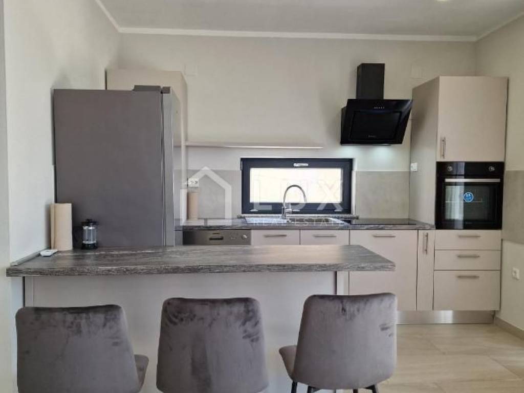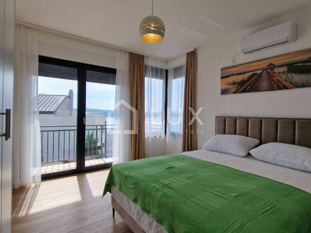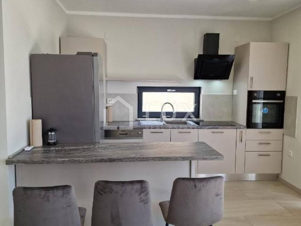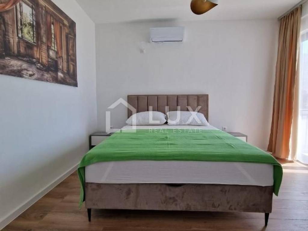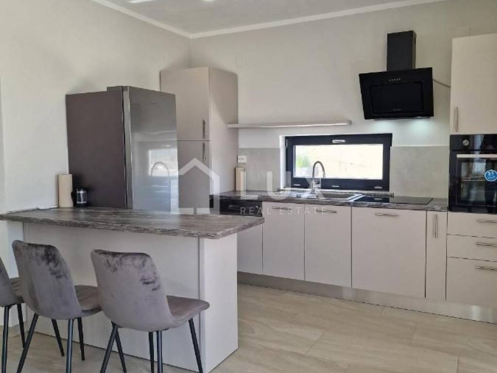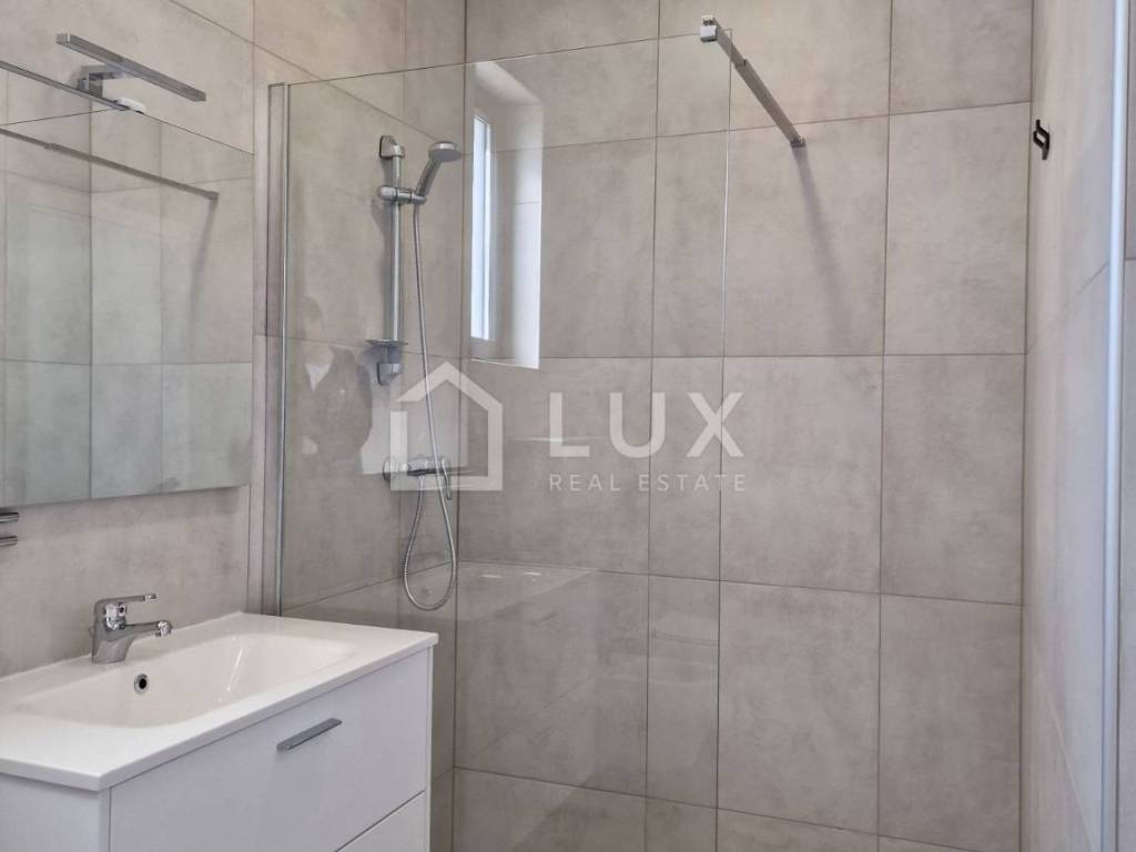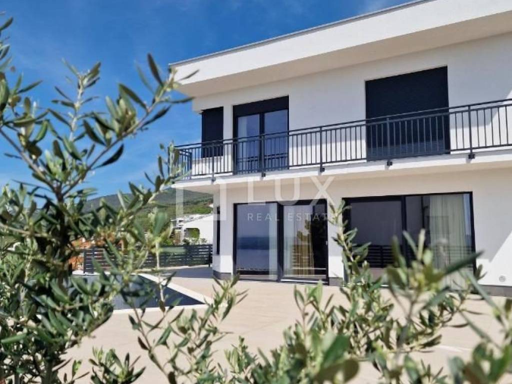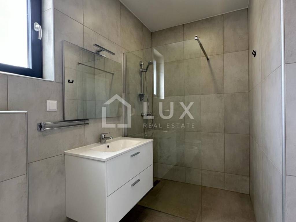 It consists of a ground floor and a first floor, interconnected by an internal staircase. Each floor offers a magnificent view of the sea and the island of Krk. On the ground floor there is a hallway, a kitchen with a dining room, a living room, a guest toilet, and one bedroom with a bathroom. Upstairs there are four bedrooms, each with its own bathroom, as well as a storage room and a laundry room. Upstairs there is also a terrace across the entire width of the villa. From the living room on the ground floor there is access to the covered terrace, directly connected to the sunbathing area next to the infinity pool with a beautiful view of the sea. The villa is also decorated with a garage with enough space for two cars, and a landscaped garden.