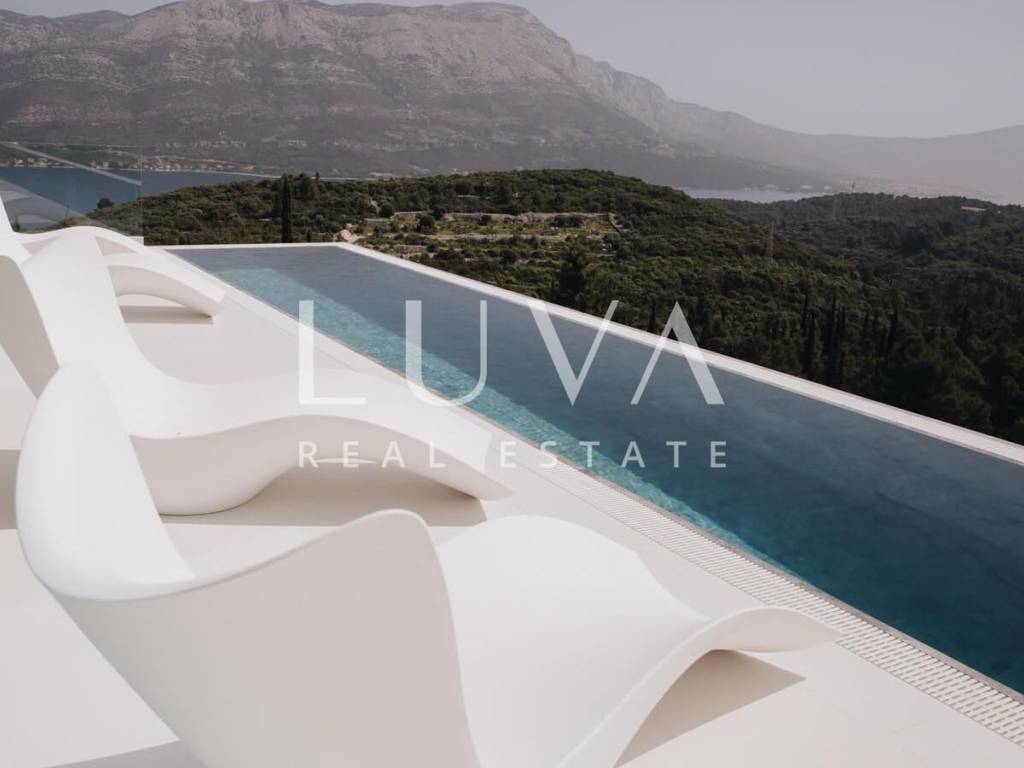A luxury villa with a stunning sea view is for sale on the island of Korčula. The villa is situated on an elevated area above the famous beautiful bay of Žrnovska Banja, just a few minutes' drive from the center of Korčula town. Built in 2023 on a 510 m² estate, the villa itself covers 360 m². It has 5 bedrooms, each with its own bathroom. The ground floor features a fully equipped modern kitchen and a living room that opens onto a terrace with an outdoor pool, offering a breathtaking panoramic view of the sea and Pelješac.