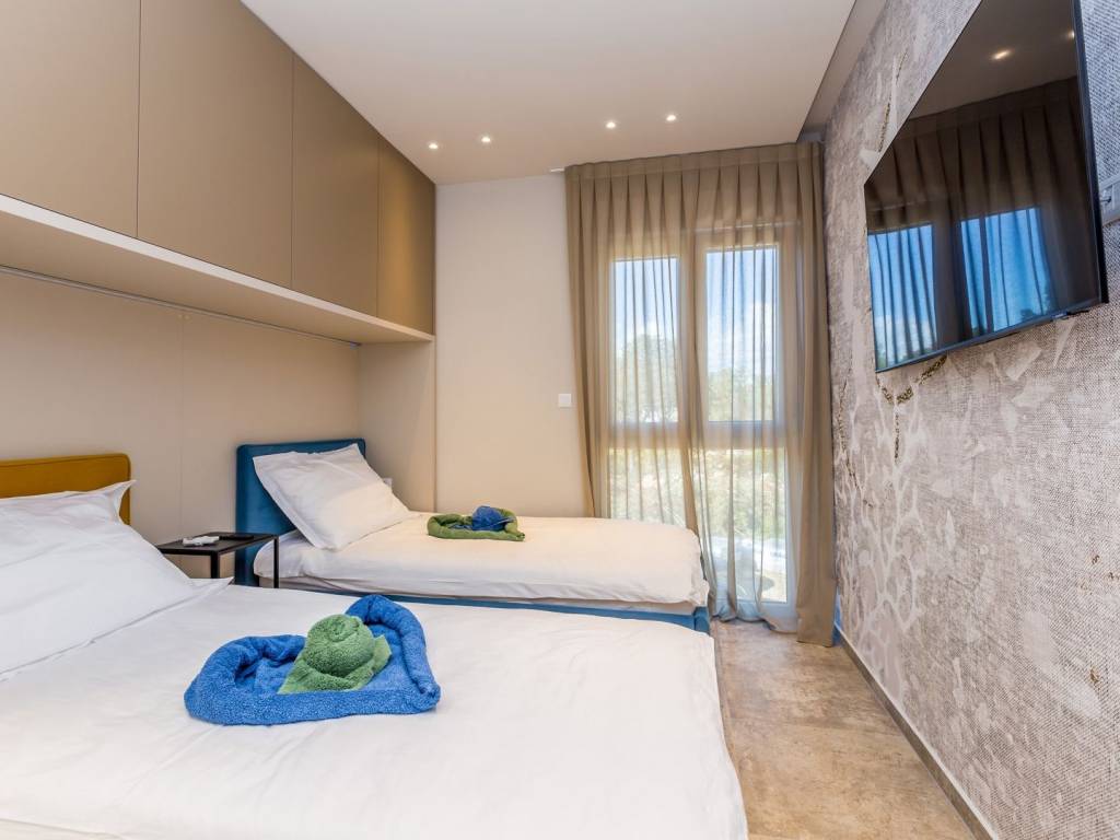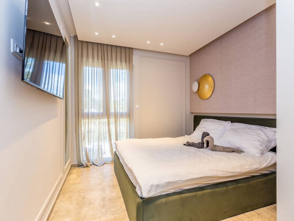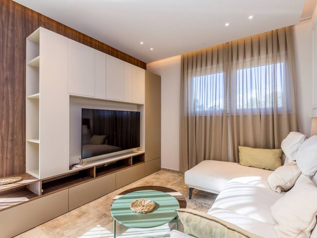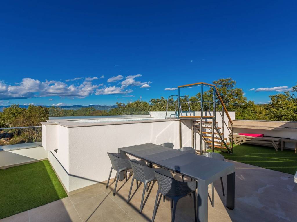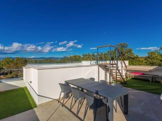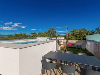 The apartment has its own entrance. On the ground floor there is a hallway, a storage room, one bedroom and a bathroom. Internal stairs lead to the first floor, where there is a living room with a kitchen and dining room, two bedrooms and a bathroom, and a balcony. On the roof terrace there is a swimming pool and sunbathing area, as well as a shower and a summer kitchen. The highest quality materials were used in the construction, energy certificate A class, electric underfloor heating in all rooms, air conditioning in all rooms. The apartment is fully furnished with designer furniture and equipped.