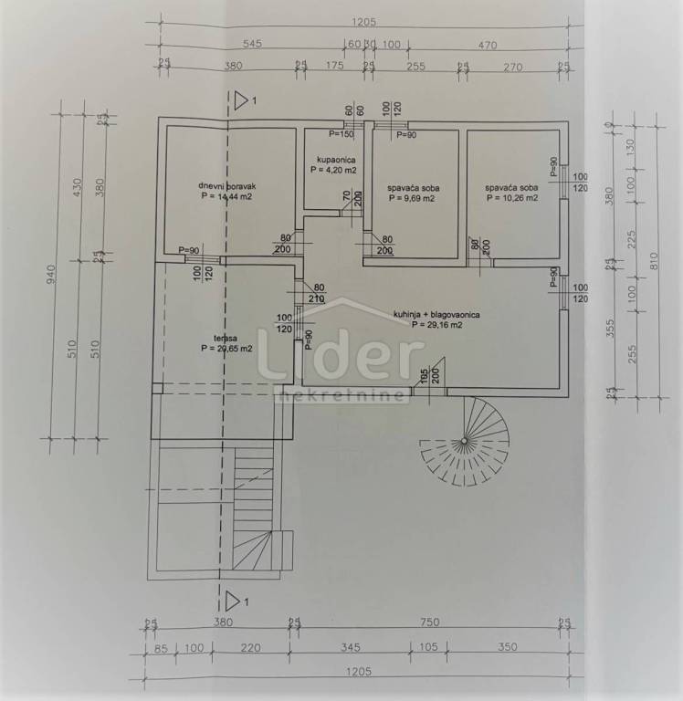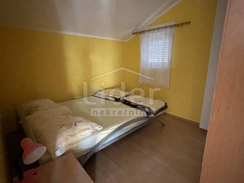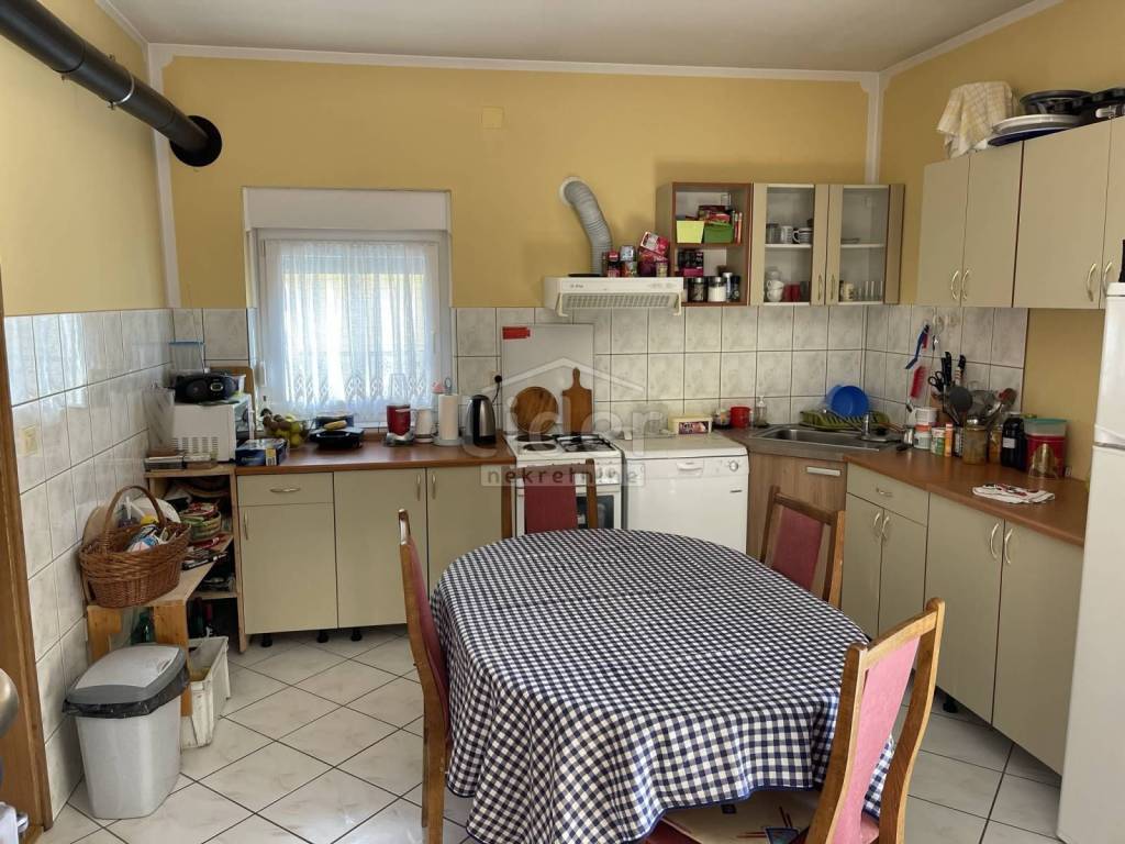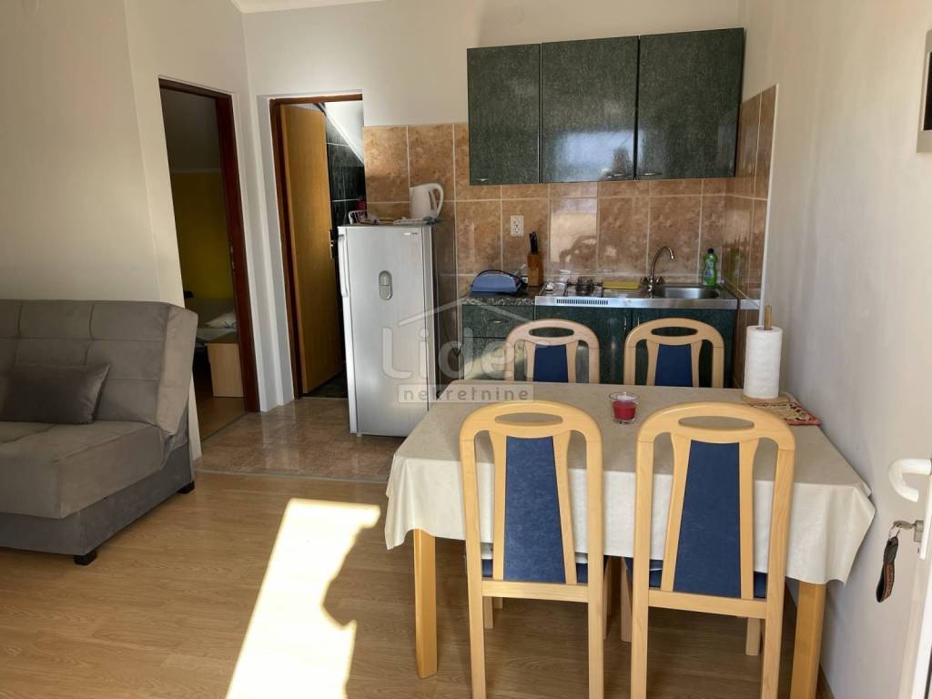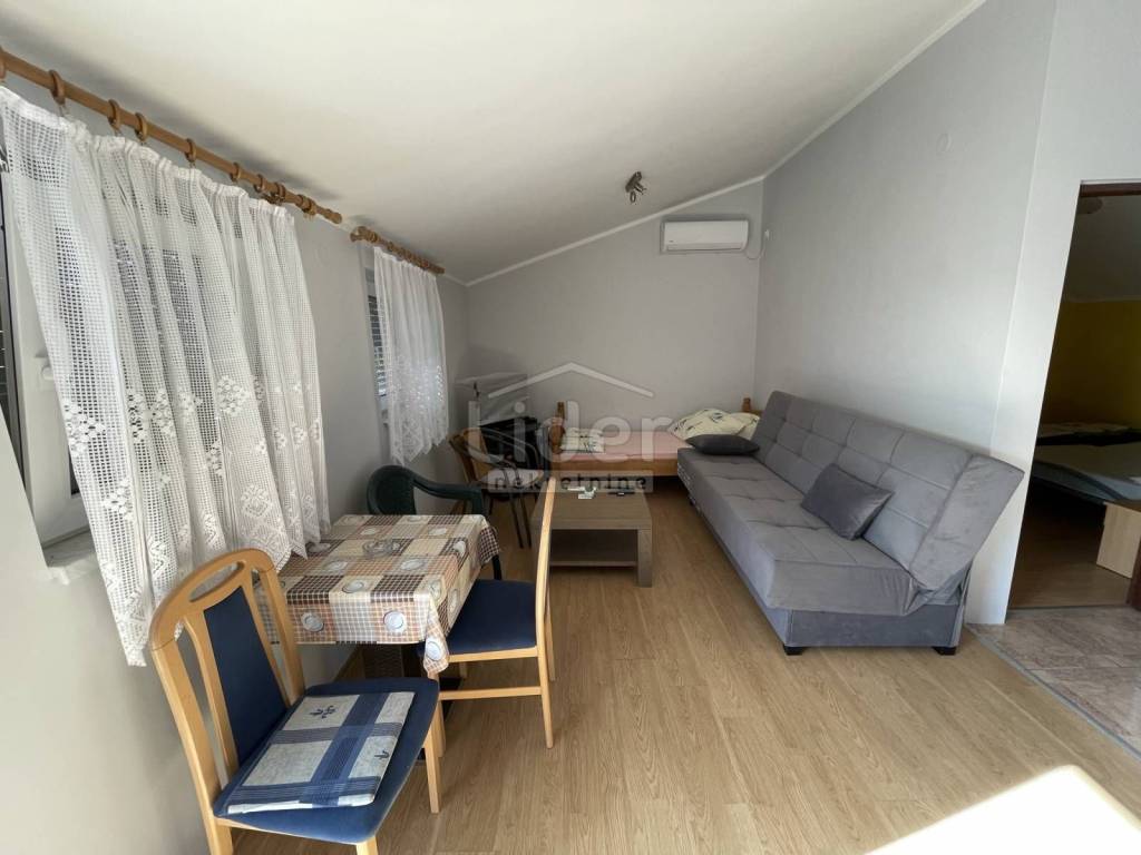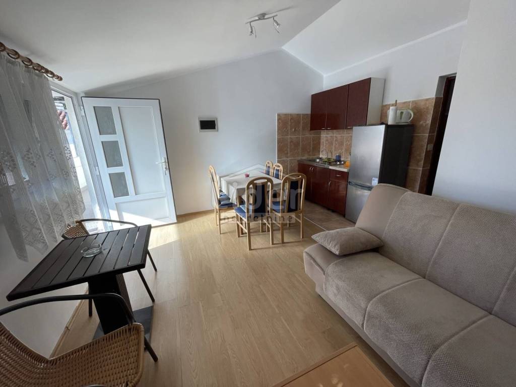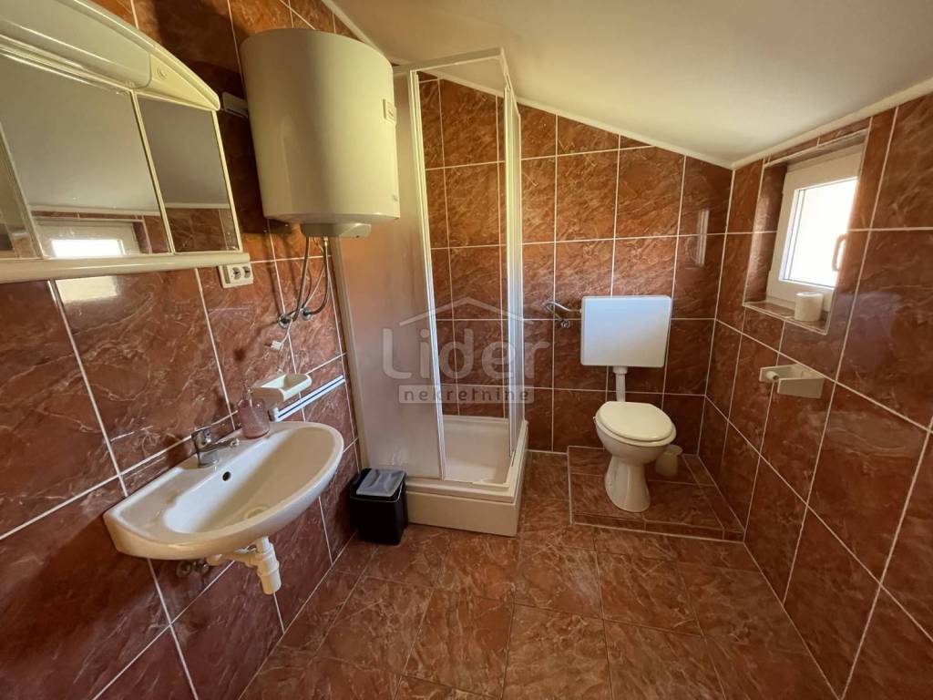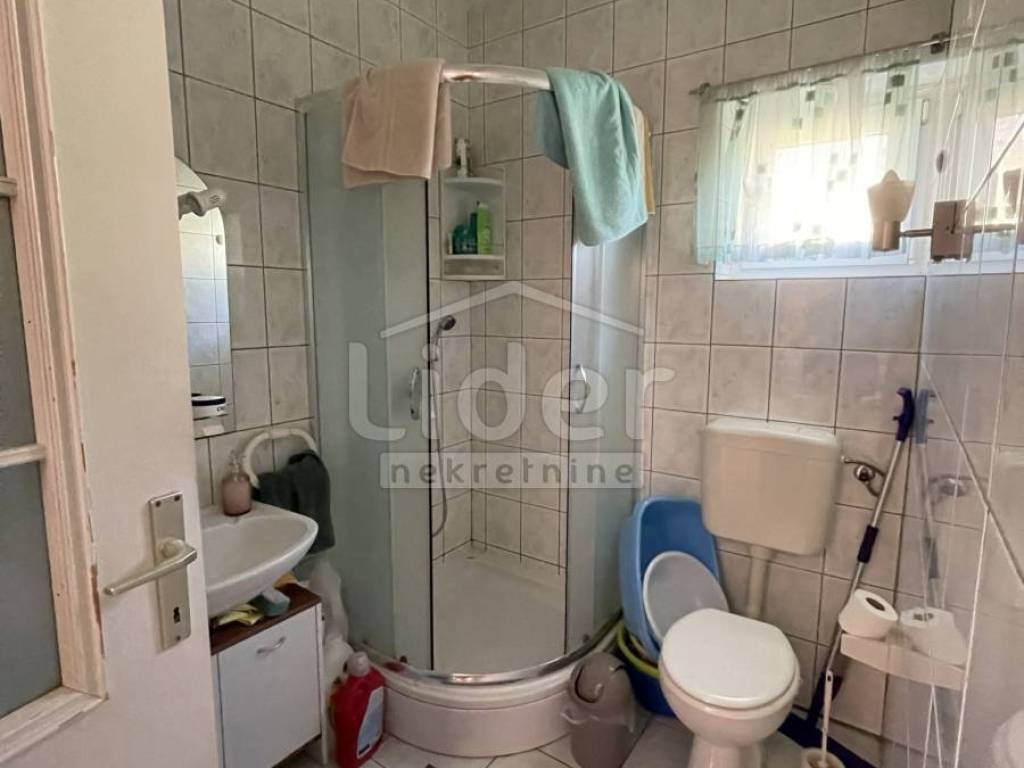 In Gornji Karin on the Karin Sea, we are selling a detached house with three residential units and a large garden. The house consists of: - Basement of 27 m2 - Ground floor with a 67m2 apartment consisting of 3 bedrooms, living room with kitchen and dining room, bathroom and 20m2 covered terrace - 1st floor with two apartments. Each apartment is about 40m2 and consists of one room, kitchen with dining room and bathroom and exit to the balcony. External spiral stairs lead from the ground floor to the balcony on the 1st floor, from which you enter each apartment.