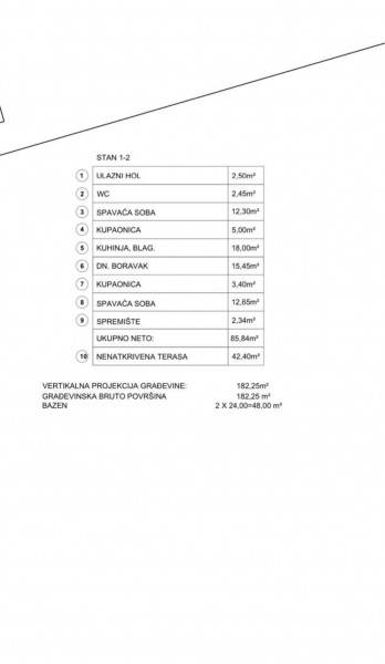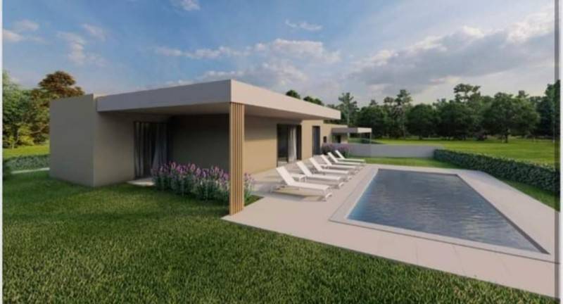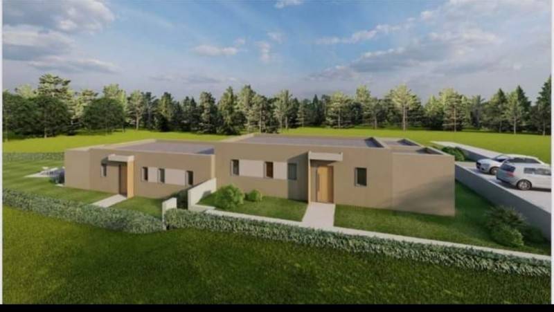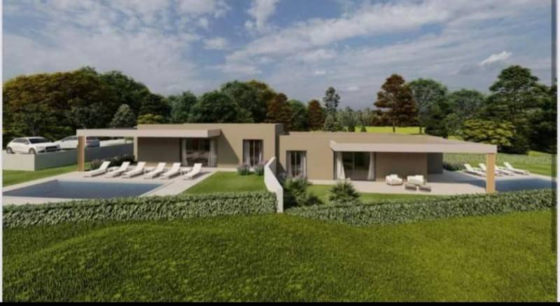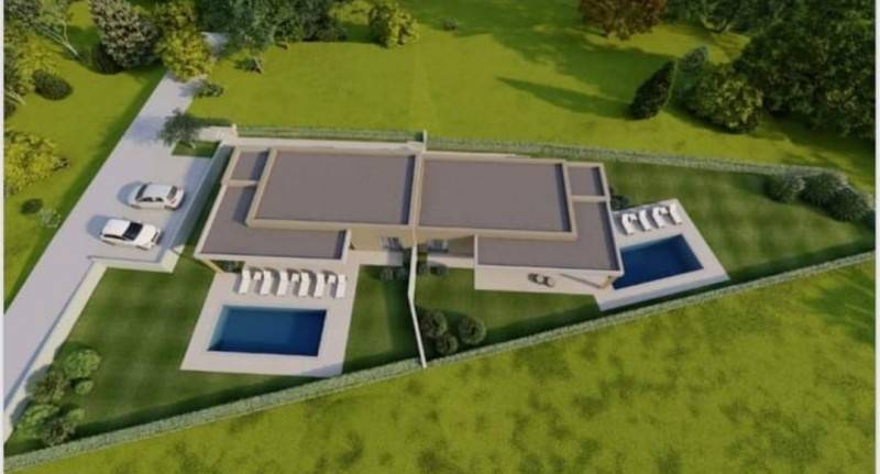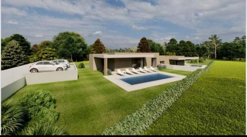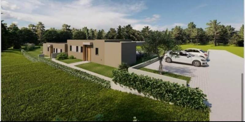 Istria, Tinjan, a double house for sale - a new building, a ground floor. In nature, these are two houses and both are for sale. Each house is located on the land 550m2, and each has its own pool. The area of the house is 85.84 m2, consists of two bedrooms, living room, kitchen with dining area, and a large terrace and pool. The houses are sold separately but it can and expensive then the price for both houses is 560,000 euros The start of the houses' construction is 05/2023 and the completion 06/2024. The houses are sold with built -in sanitary facilities without furniture.